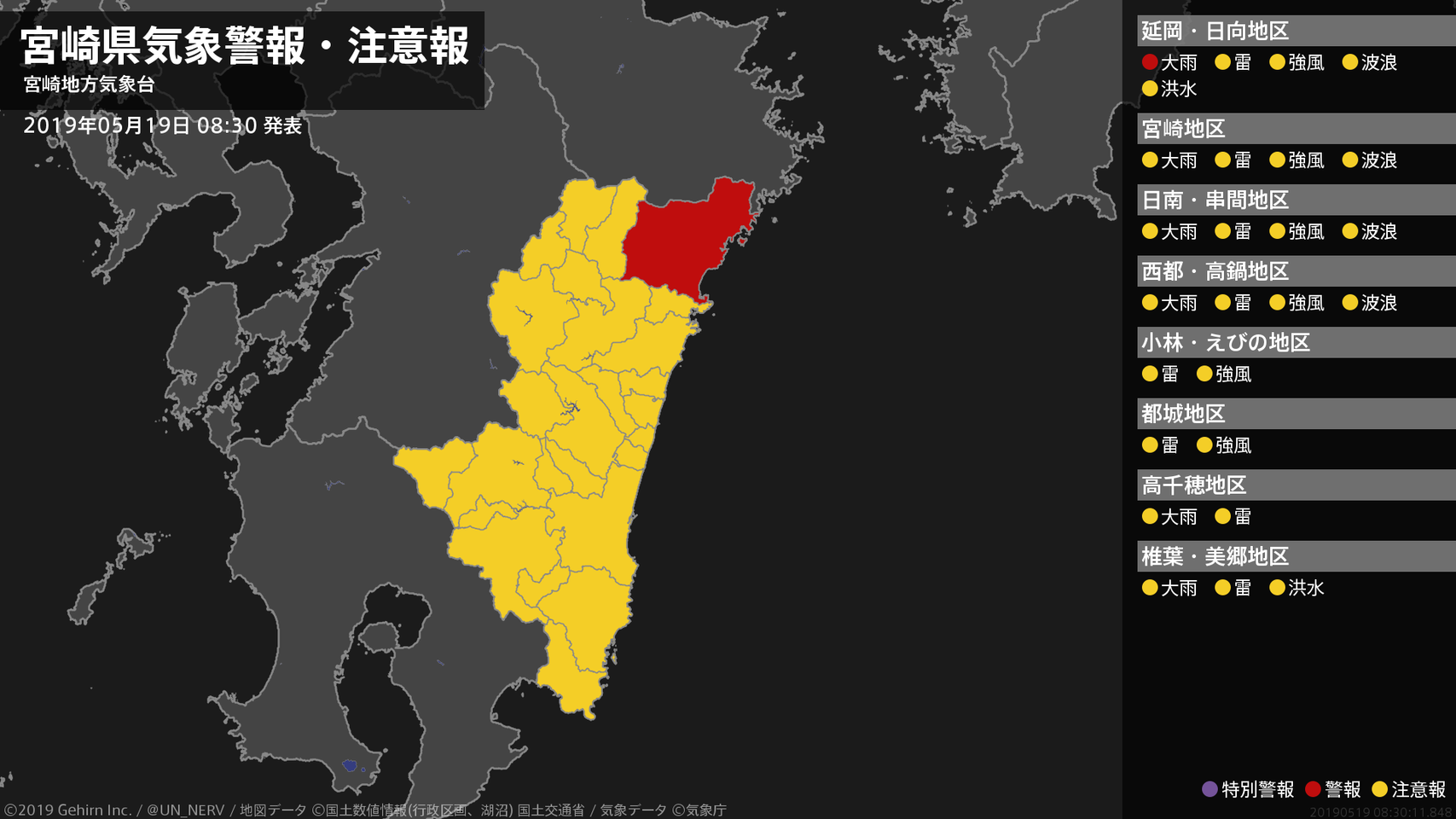 【宮崎県 気象警報・注意報 2019年05月19日 08:30】北部平野部では、20日朝まで土砂災害に警戒してください。#気象警報注意報 #宮崎県