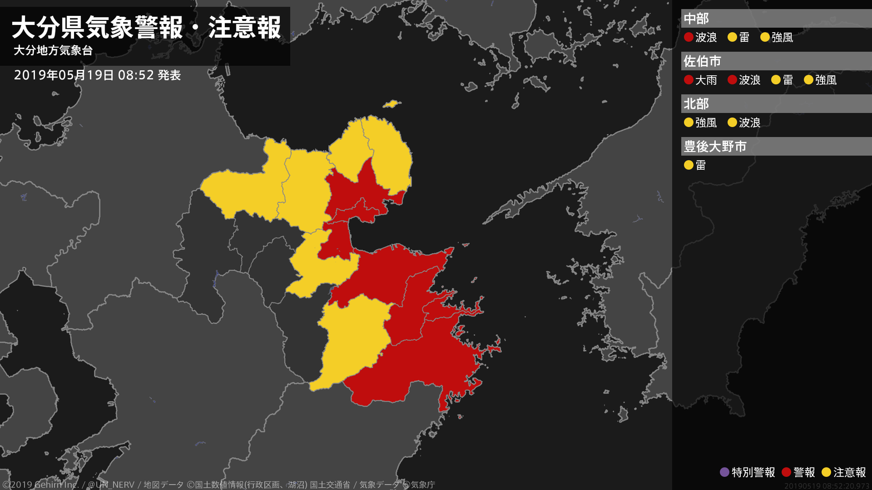 【大分県 気象警報・注意報 2019年05月19日 08:52】南部では、土砂災害に警戒してください。中部、南部では、高波に警戒してください。#気象警報注意報 #大分県