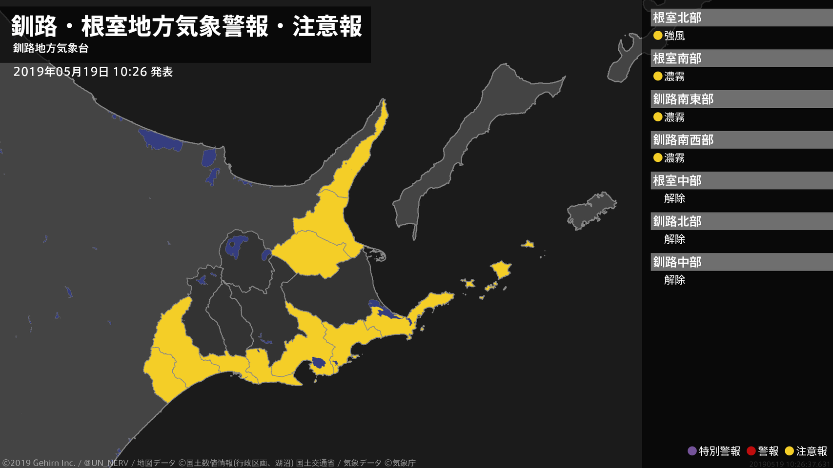 【釧路・根室地方 気象警報・注意報 2019年05月19日 10:26】根室地方では、強風に注意してください。根室、釧路地方では、濃霧による視程障害に注意してください。#気象警報注意報 #根室地方 #釧路地方