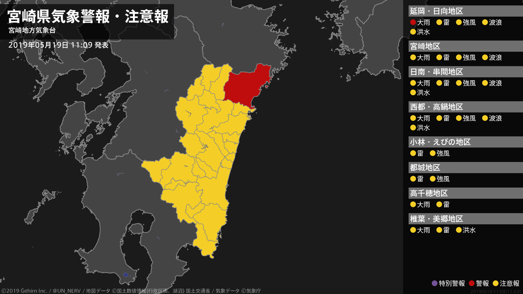 【宮崎県 気象警報・注意報 2019年05月19日 11:09】北部平野部では、20日朝まで土砂災害に警戒してください。#気象警報注意報 #宮崎県
