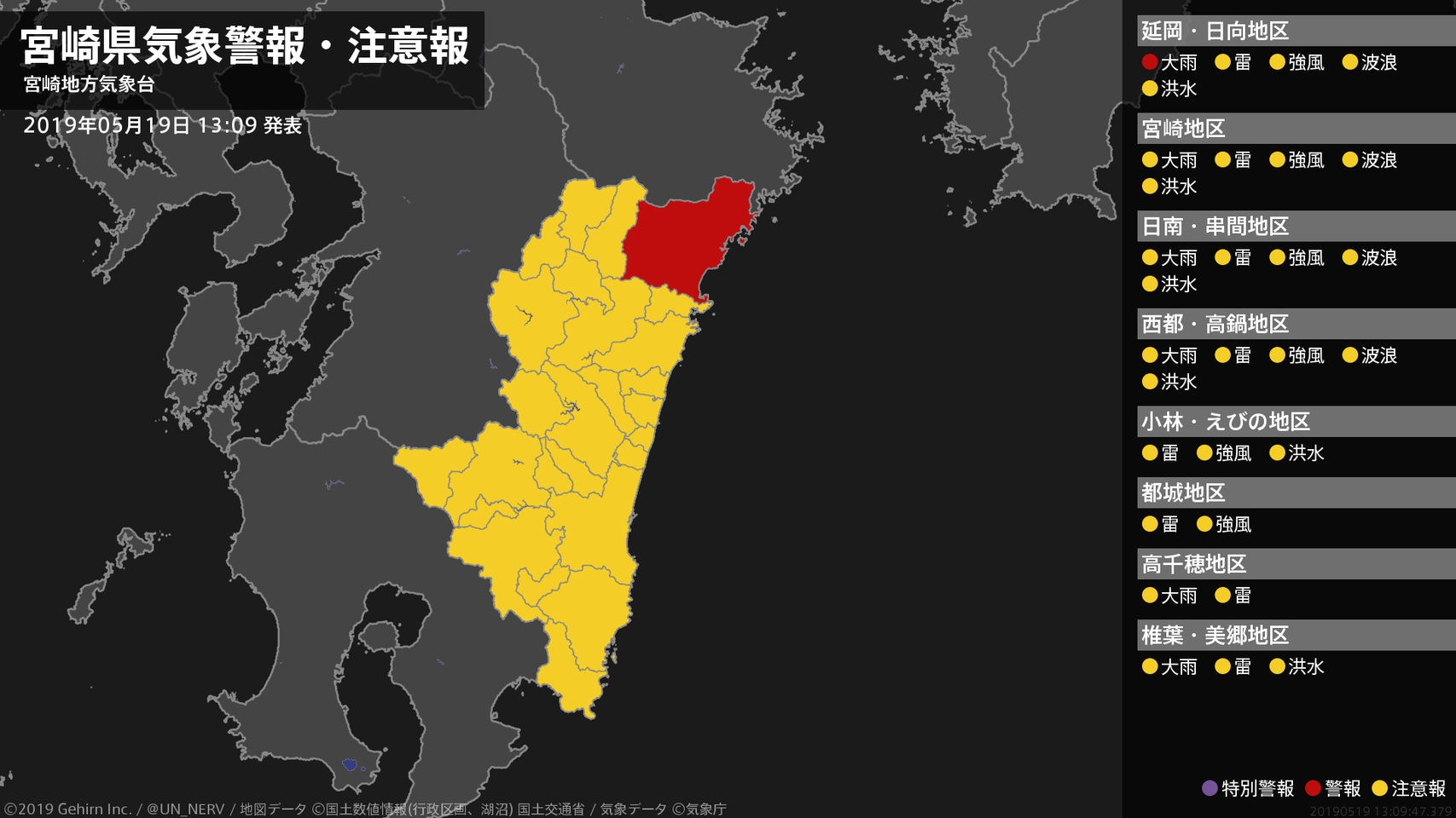 【宮崎県 気象警報・注意報 2019年05月19日 13:09】北部平野部では、20日朝まで土砂災害に警戒してください。#気象警報注意報 #宮崎県