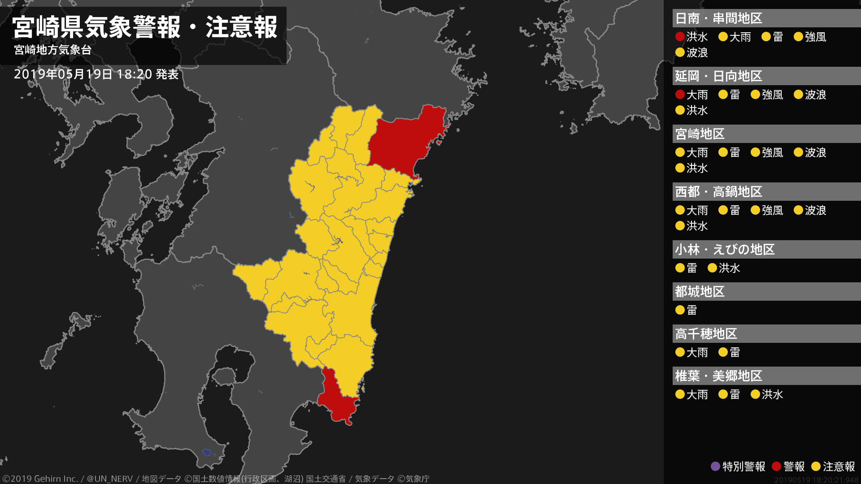 【宮崎県 気象警報・注意報 2019年05月19日 18:20】北部平野部では、20日朝まで土砂災害に警戒してください。南部平野部では、20日朝まで河川の増水に警戒してください。#気象警報注意報 #宮崎県
