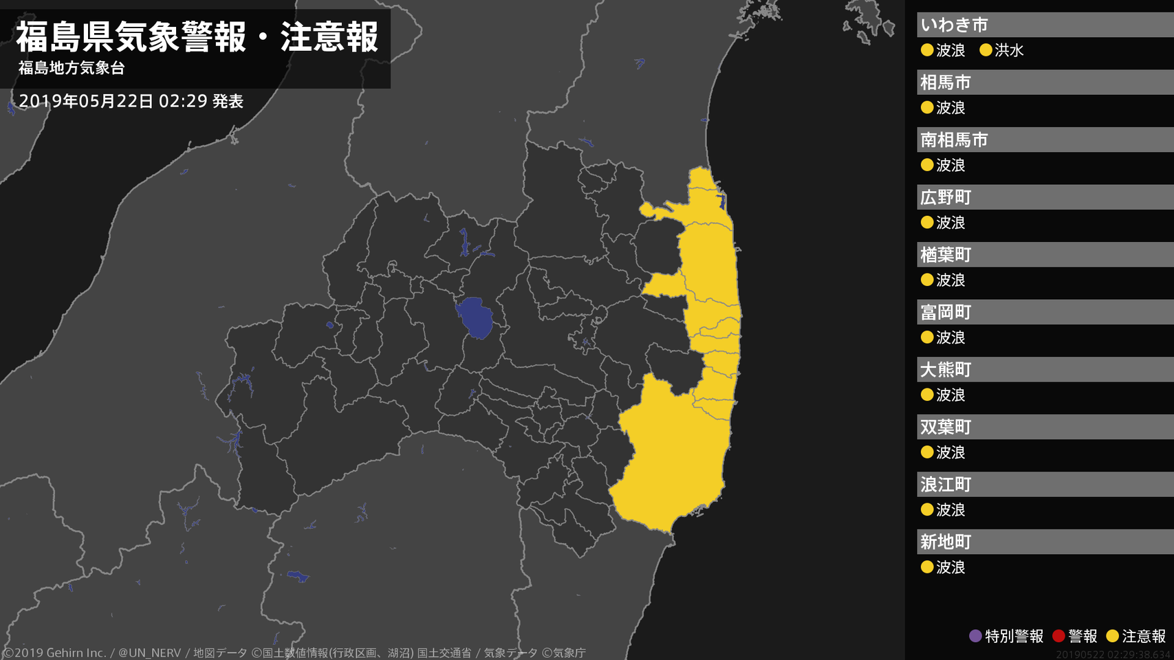 【福島県 気象警報・注意報 2019年05月22日 02:29】浜通りでは、河川の増水や高波に注意してください。#気象警報注意報 #福島県