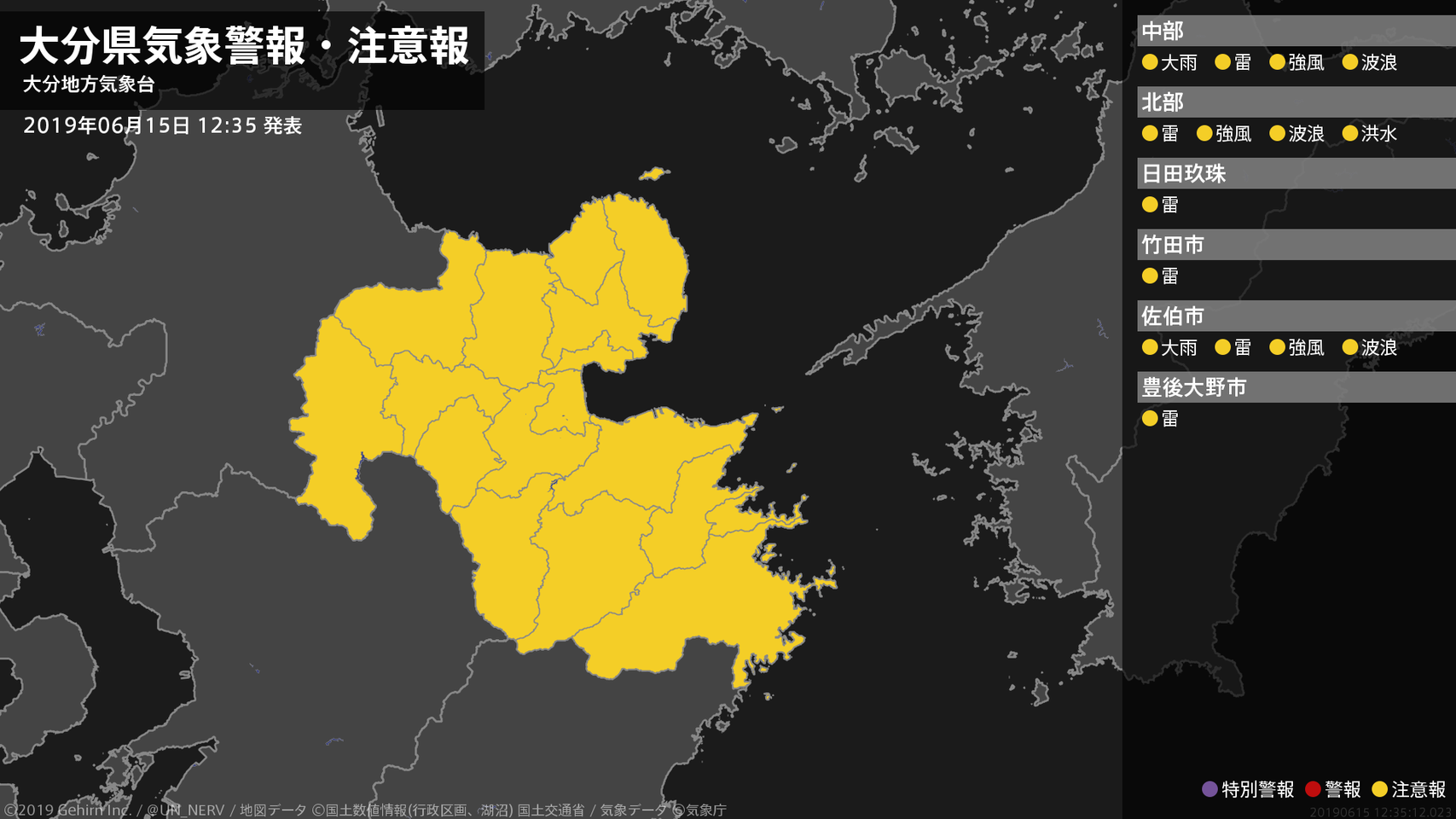 【大分県 気象警報・注意報 2019年06月15日 12:35】中部、南部では、土砂災害に注意してください。北部では、河川の増水に注意してください。中部、北部、南部では、強風や高波に注意してください。大分県では、落雷に注意してください。#気象警報注意報 #大分県