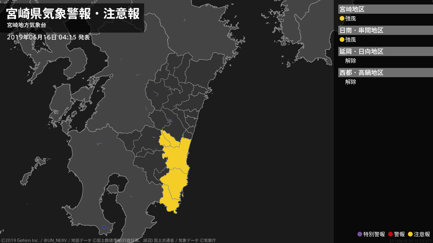 【宮崎県 気象警報・注意報 2019年06月16日 04:15】