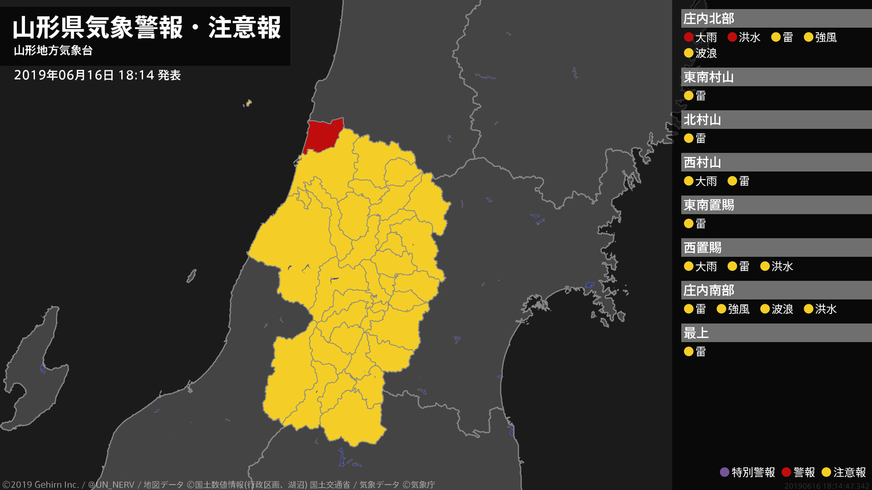 【山形県 気象警報・注意報 2019年06月16日 18:14】