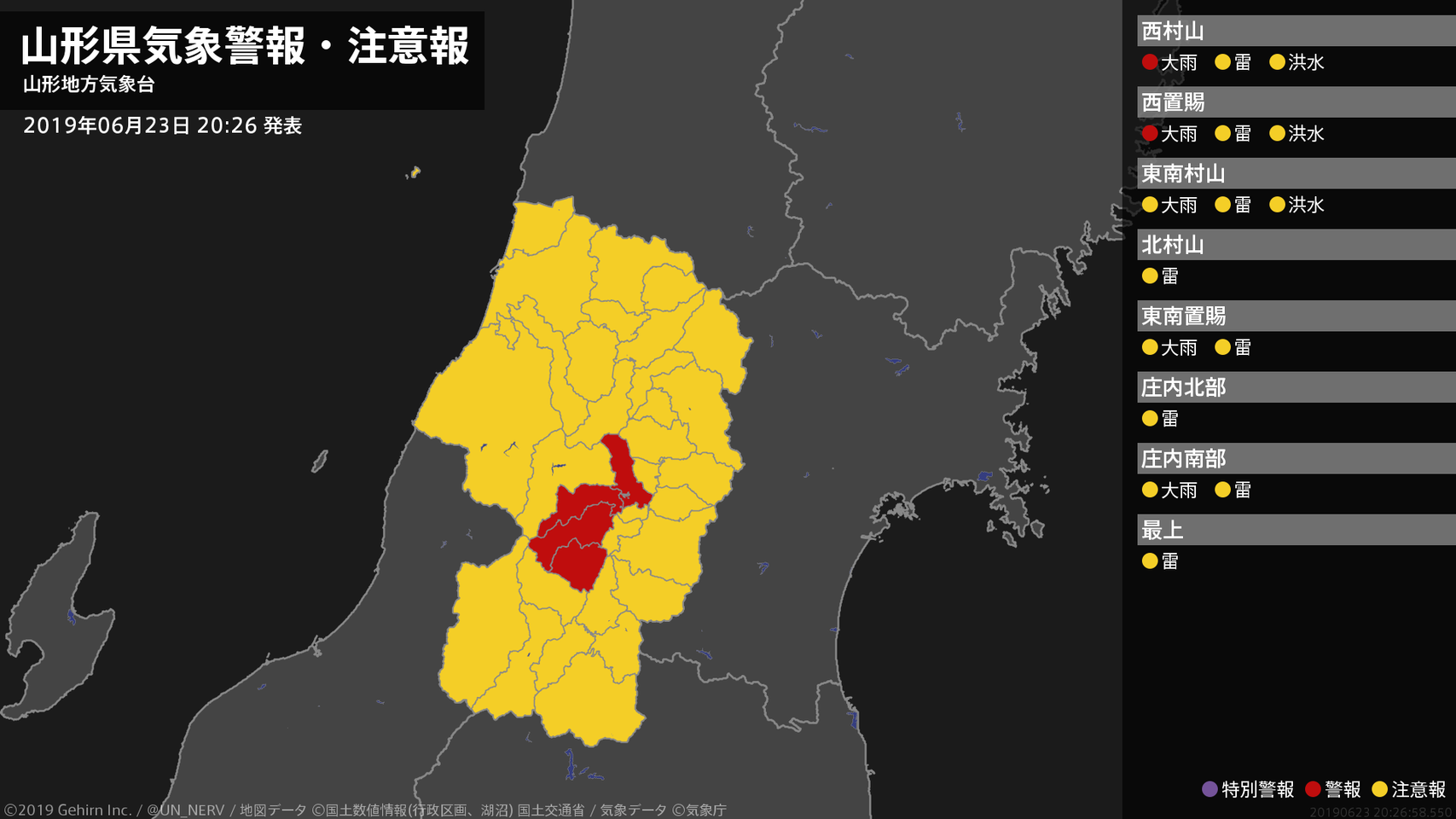 【山形県 気象警報・注意報 2019年06月23日 20:26】村山、置賜では、23日夜遅くまで土砂災害に警戒してください。#気象警報注意報 #山形県