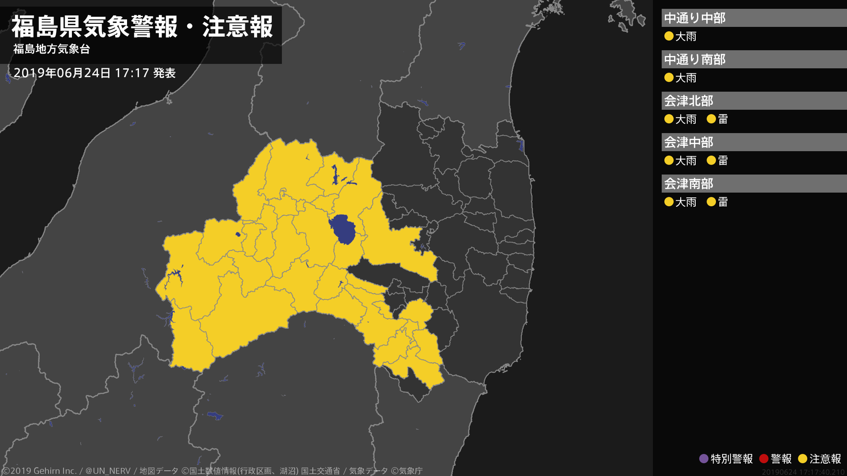 【福島県 気象警報・注意報 2019年06月24日 17:17】中通り、会津では、24日夜遅くまで土砂災害に注意してください。会津では、24日夜遅くまで落雷に注意してください。#気象警報注意報 #福島県