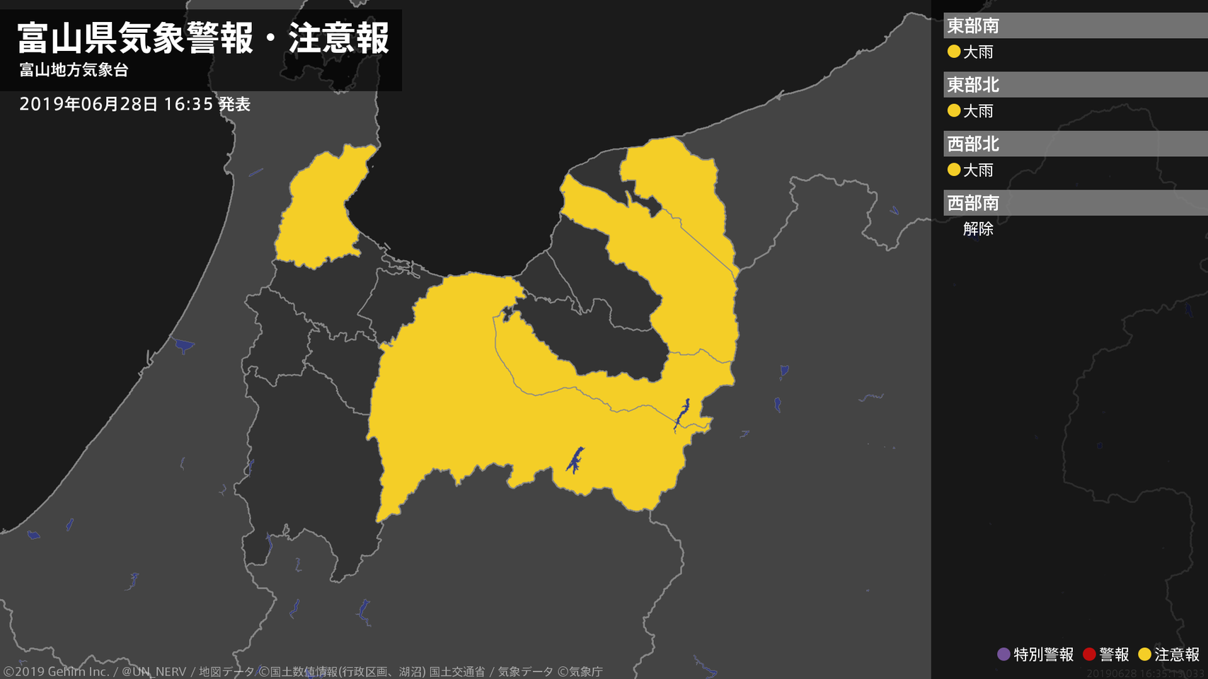【富山県 気象警報・注意報 2019年06月28日 16:35】富山県では、28日夜のはじめ頃まで土砂災害に注意してください。#気象警報注意報 #富山県