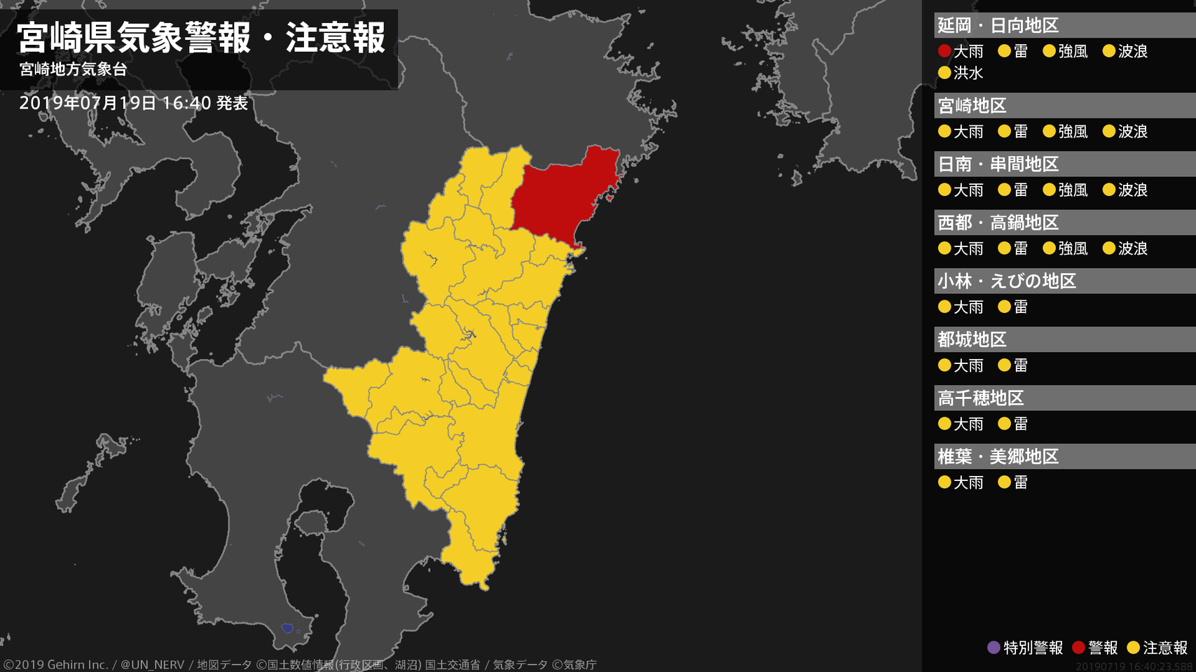【宮崎県 気象警報・注意報 2019年07月19日 16:40】北部平野部では、土砂災害に警戒してください。#気象警報注意報 #宮崎県