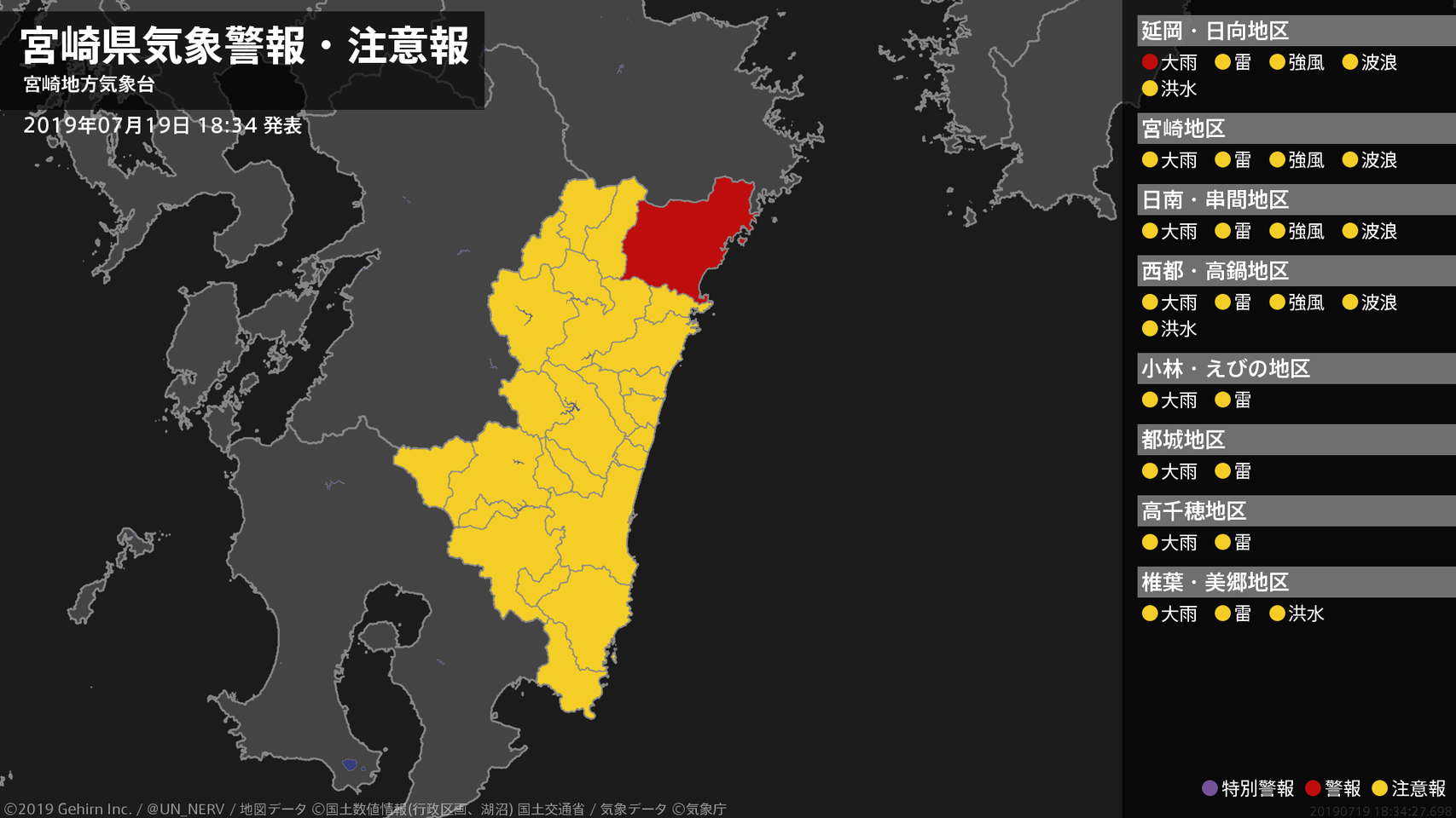 【宮崎県 気象警報・注意報 2019年07月19日 18:34】北部平野部では、土砂災害に警戒してください。#気象警報注意報 #宮崎県