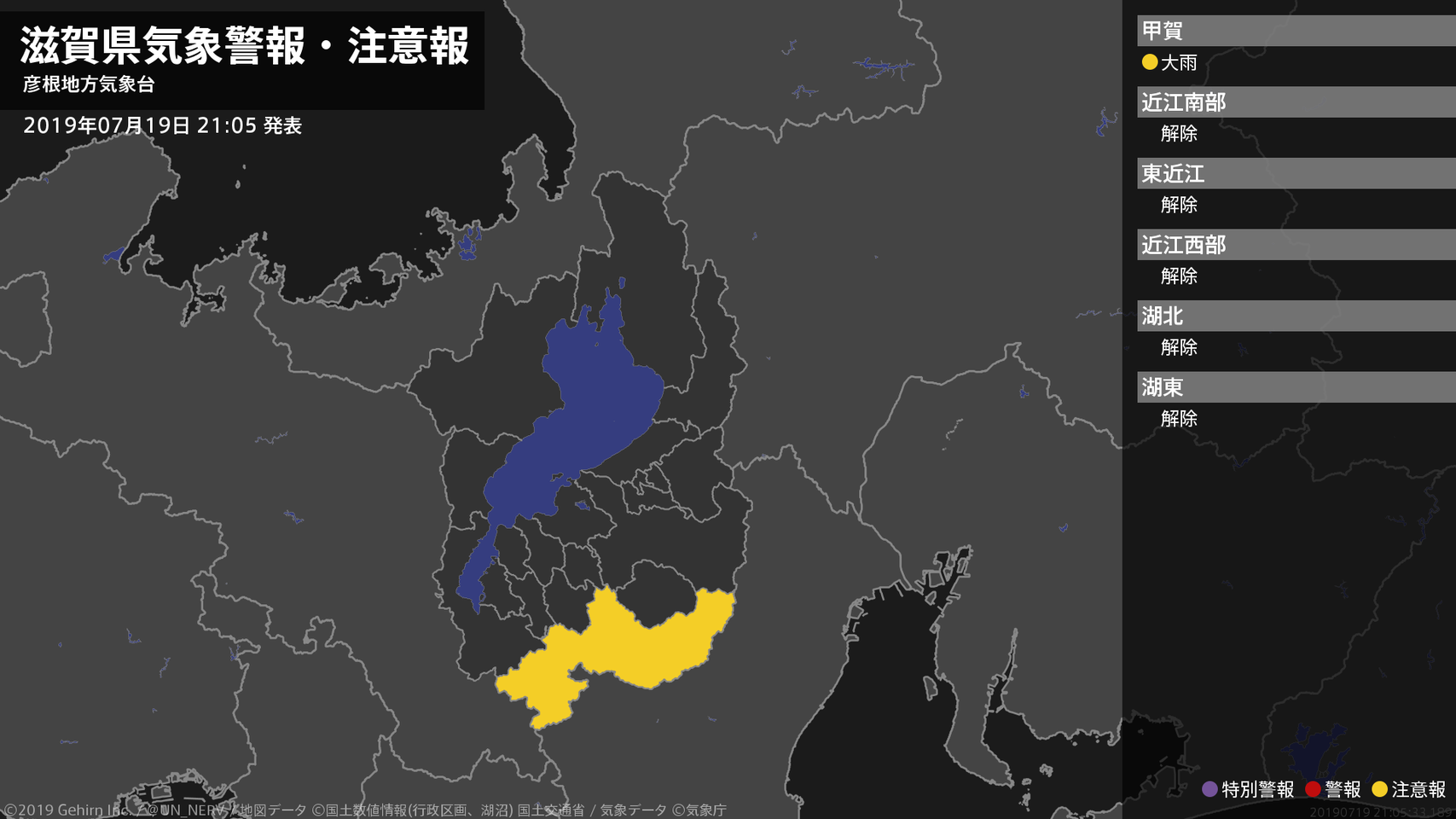 【滋賀県 気象警報・注意報 2019年07月19日 21:05】