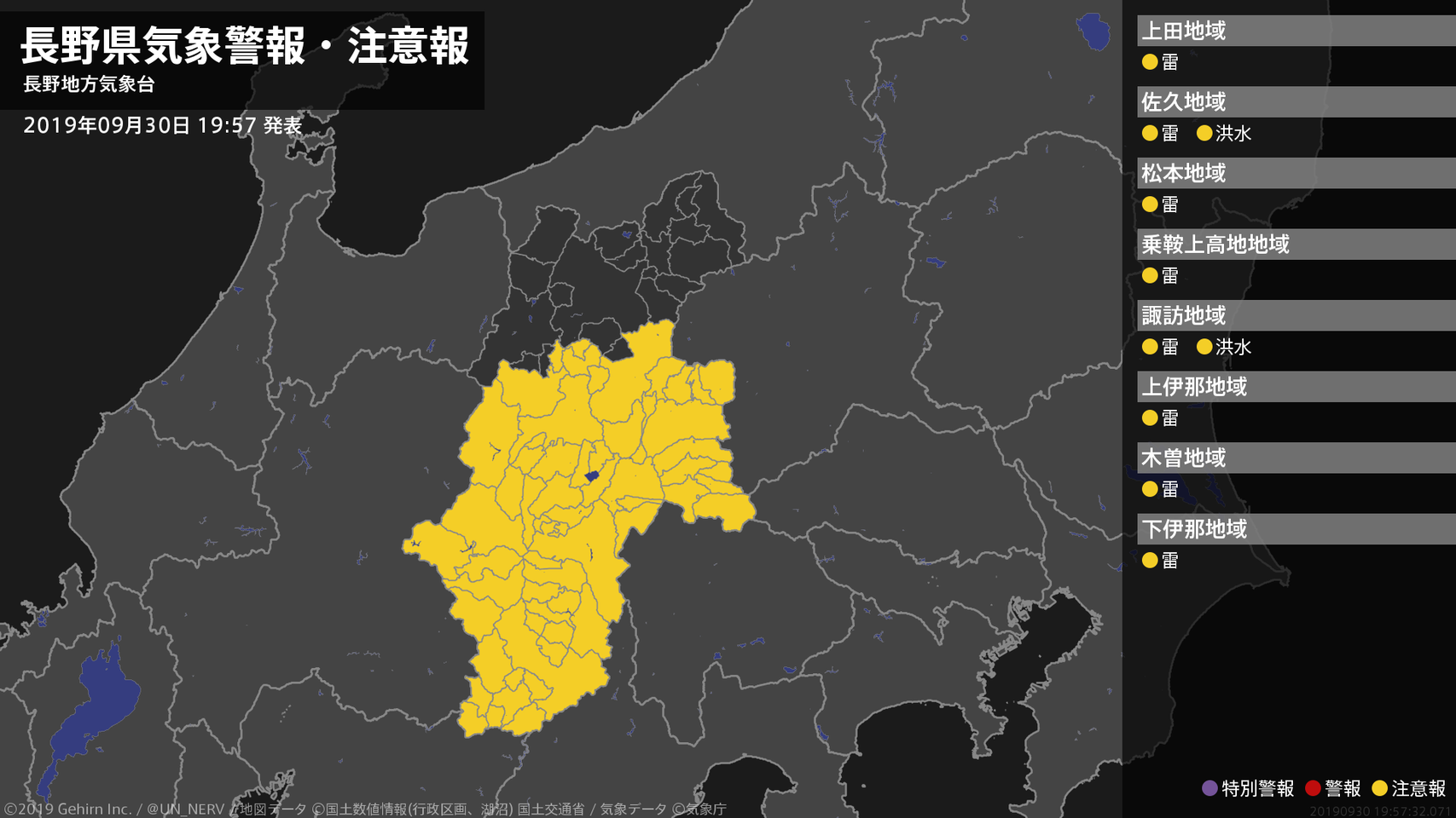 【長野県 気象警報・注意報 2019年09月30日 19:57】中部では、30日夜遅くまで河川の増水に注意してください。中部、南部では、30日夜遅くまで落雷に注意してください。#気象警報注意報 #長野県