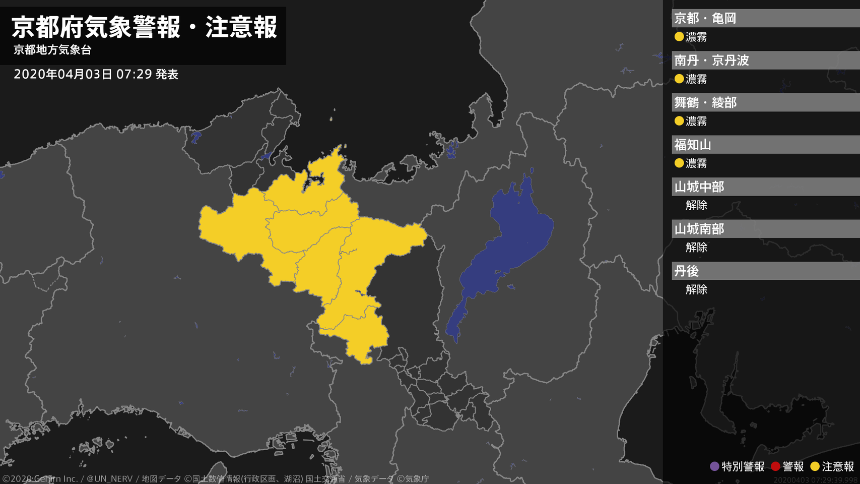 【京都府 気象警報・注意報 2020年04月03日 07:29】京都府では、3日昼前まで濃霧による視程障害に注意してください。#気象警報注意報 #京都府