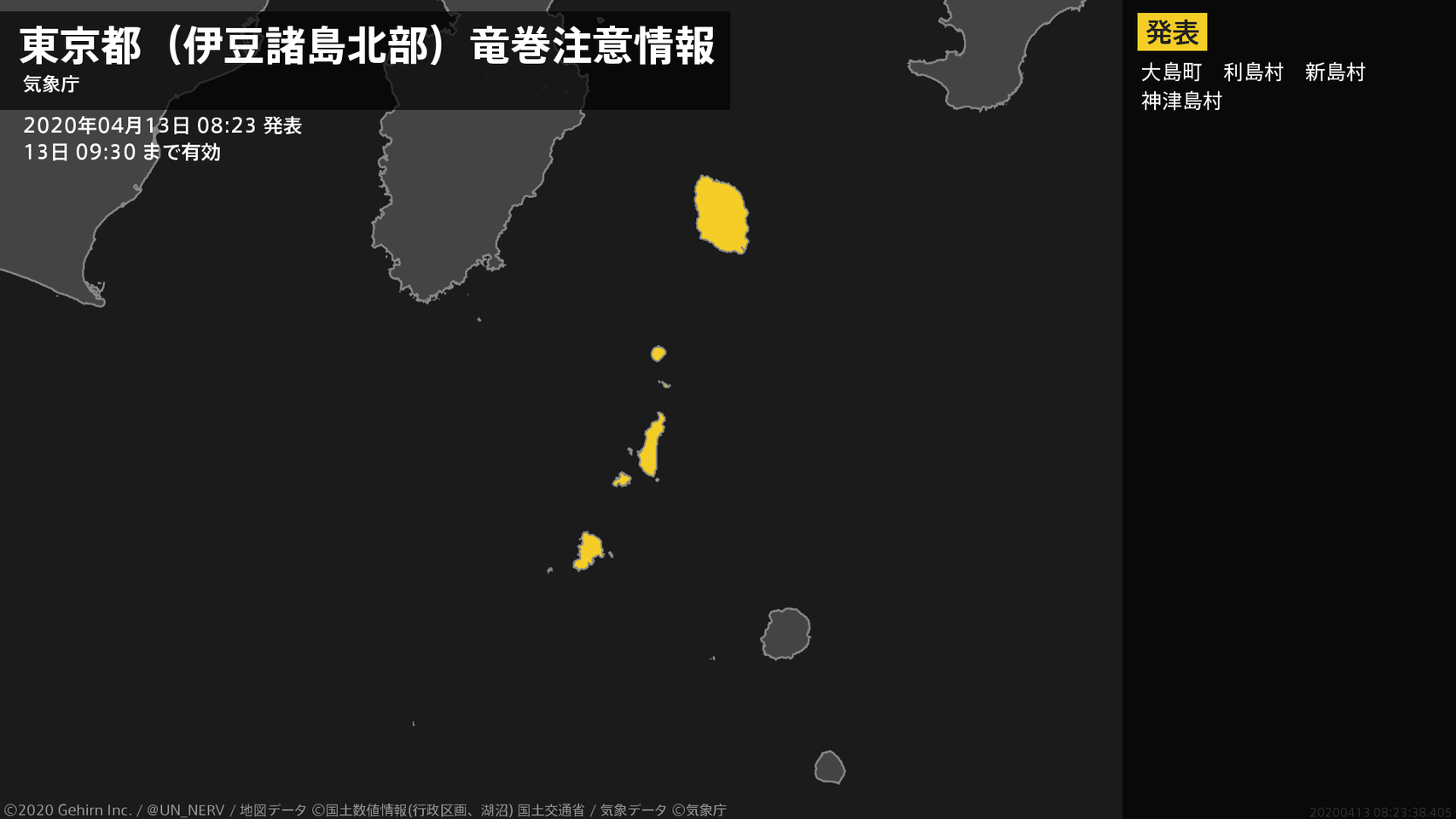 【東京都(伊豆諸島北部) 竜巻注意情報】東京都(伊豆諸島北部)は、竜巻などの激しい突風が発生しやすい気象状況になっています。頑丈な建物内に移動するなど安全確保に努めてください。この情報は13日09:30まで有効です。#竜巻注意情報 #伊豆諸島北部