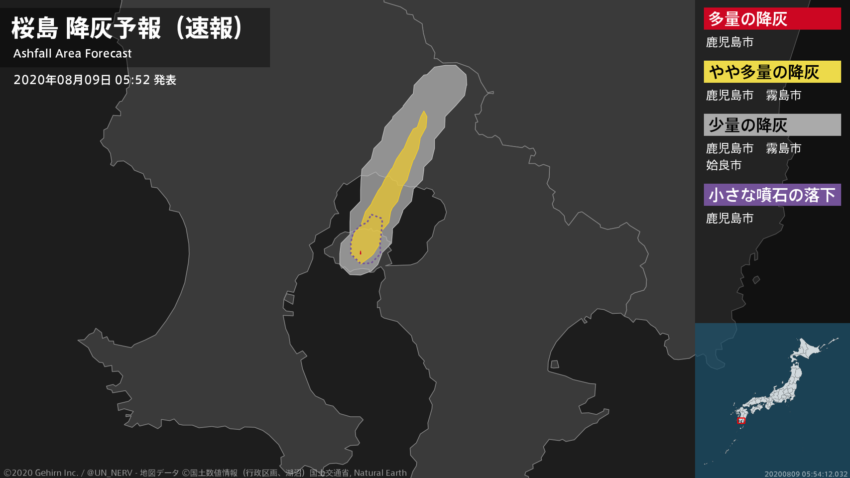 1時間以内に鹿児島市(桜島)では多量の降灰があり、降灰は鹿児島県霧島市まで予想されます。また、火口から北東方向およそ8kmまでの範囲では、小さな噴石が風に流されて降るおそれがあります。
