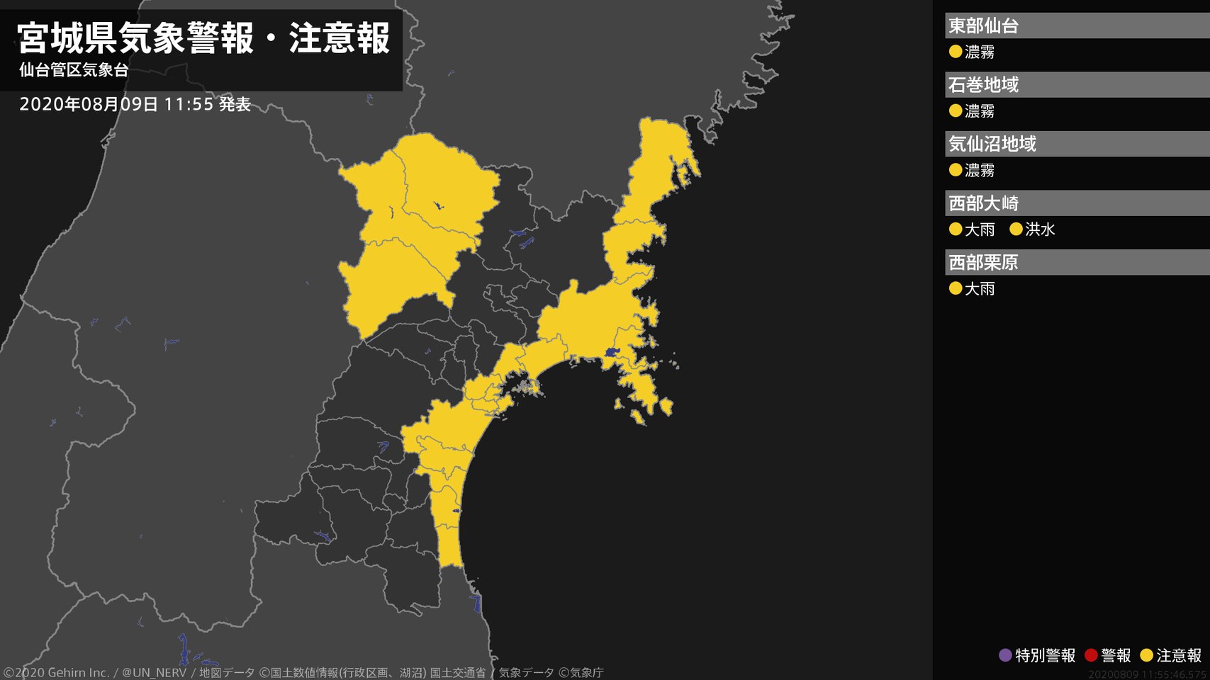 【宮城県 気象警報・注意報 2020年08月09日 11:55】西部では、9日夕方まで土砂災害や河川の増水に注意してください。東部では、9日夕方まで濃霧による視程障害に注意してください。#気象警報注意報 #宮城県