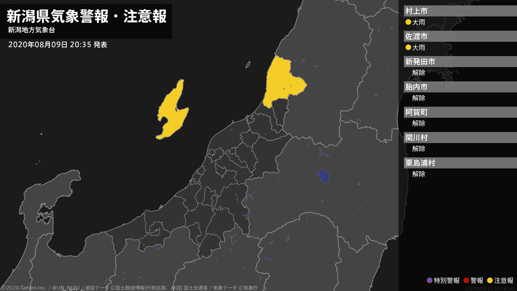 【新潟県 気象警報(解除) 2020年08月09日 20:35】新潟県に発表されていた気象警報はすべて解除されました。下越、佐渡では、10日明け方まで土砂災害に注意してください。#気象警報 #新潟県