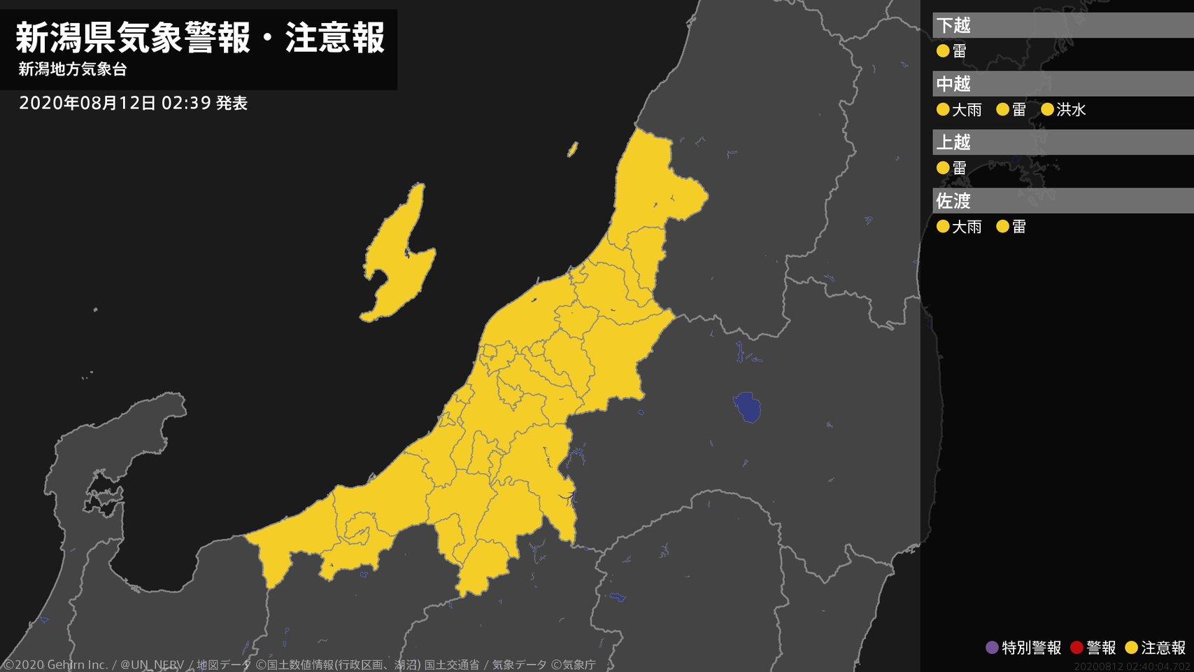 【新潟県 気象警報・注意報 2020年08月12日 02:40】佐渡では、12日昼前まで土砂災害に注意してください。中越では、12日朝まで低い土地の浸水や河川の増水に注意してください。新潟県では、12日夜のはじめ頃まで落雷に注意してください。#気象警報注意報 #新潟県