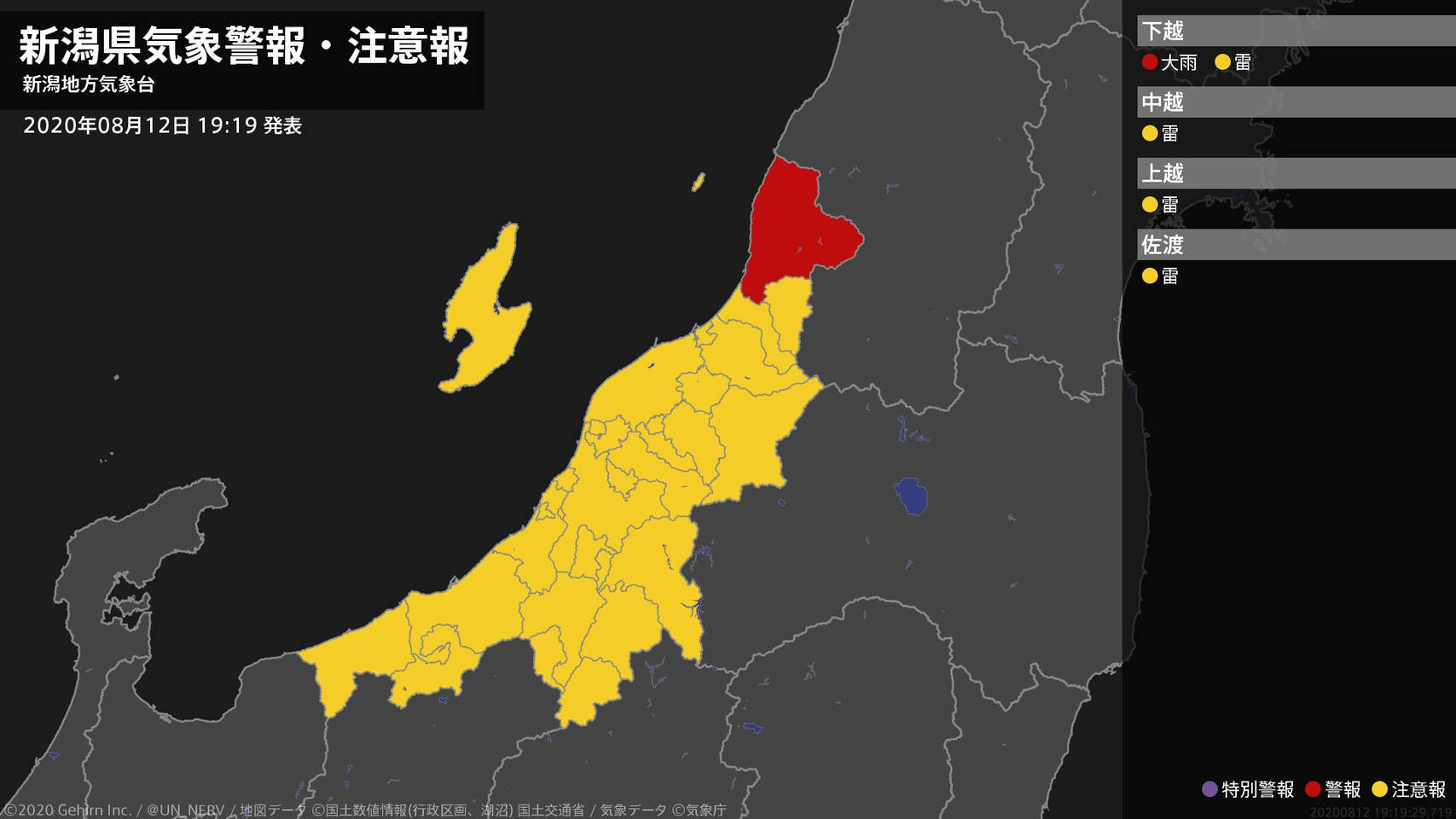 【新潟県 気象警報 2020年08月12日 19:19】下越では、13日明け方まで土砂災害に警戒してください。#気象警報 #気象警報注意報 #新潟県