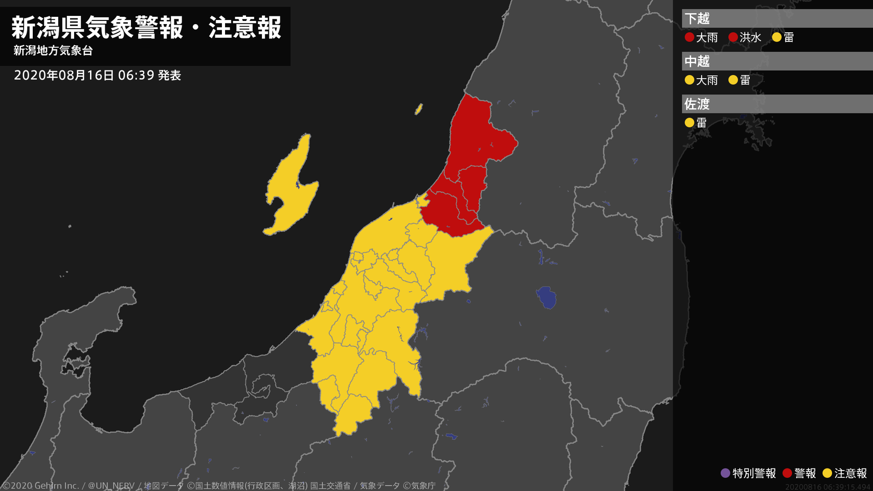 【新潟県 気象警報・注意報 2020年08月16日 06:39】下越では、16日昼前まで土砂災害に、16日朝まで河川の増水に警戒してください。#気象警報注意報 #新潟県
