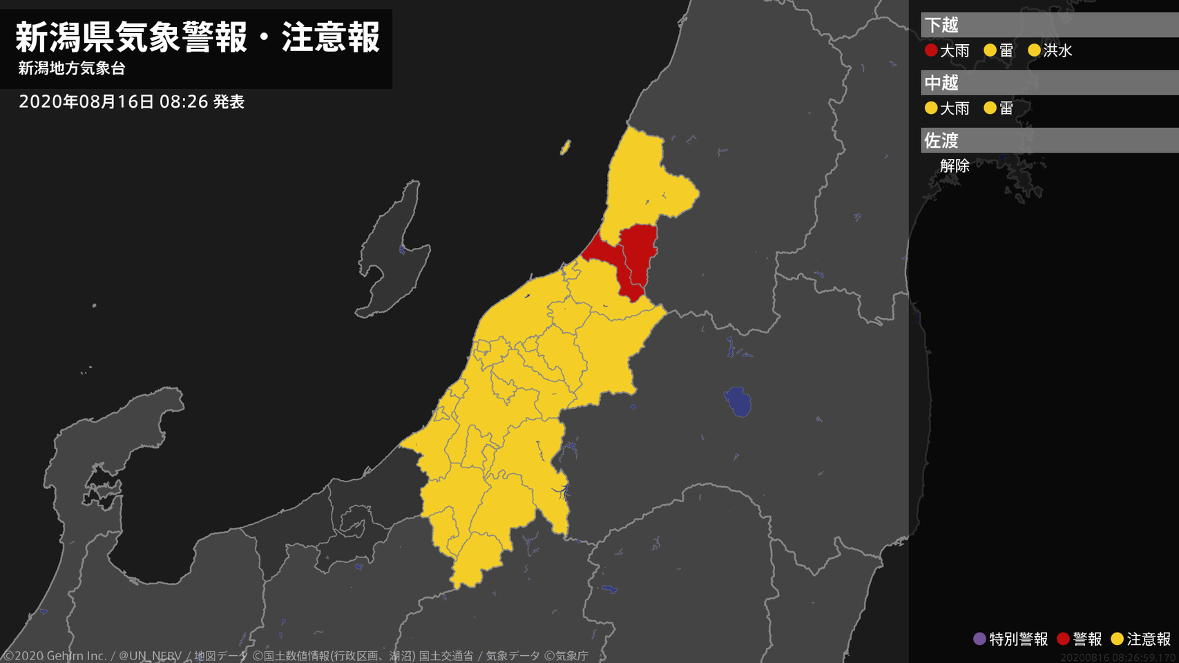 【新潟県 気象警報 2020年08月16日 08:26】下越では、16日昼前まで土砂災害に警戒してください。#気象警報 #気象警報注意報 #新潟県