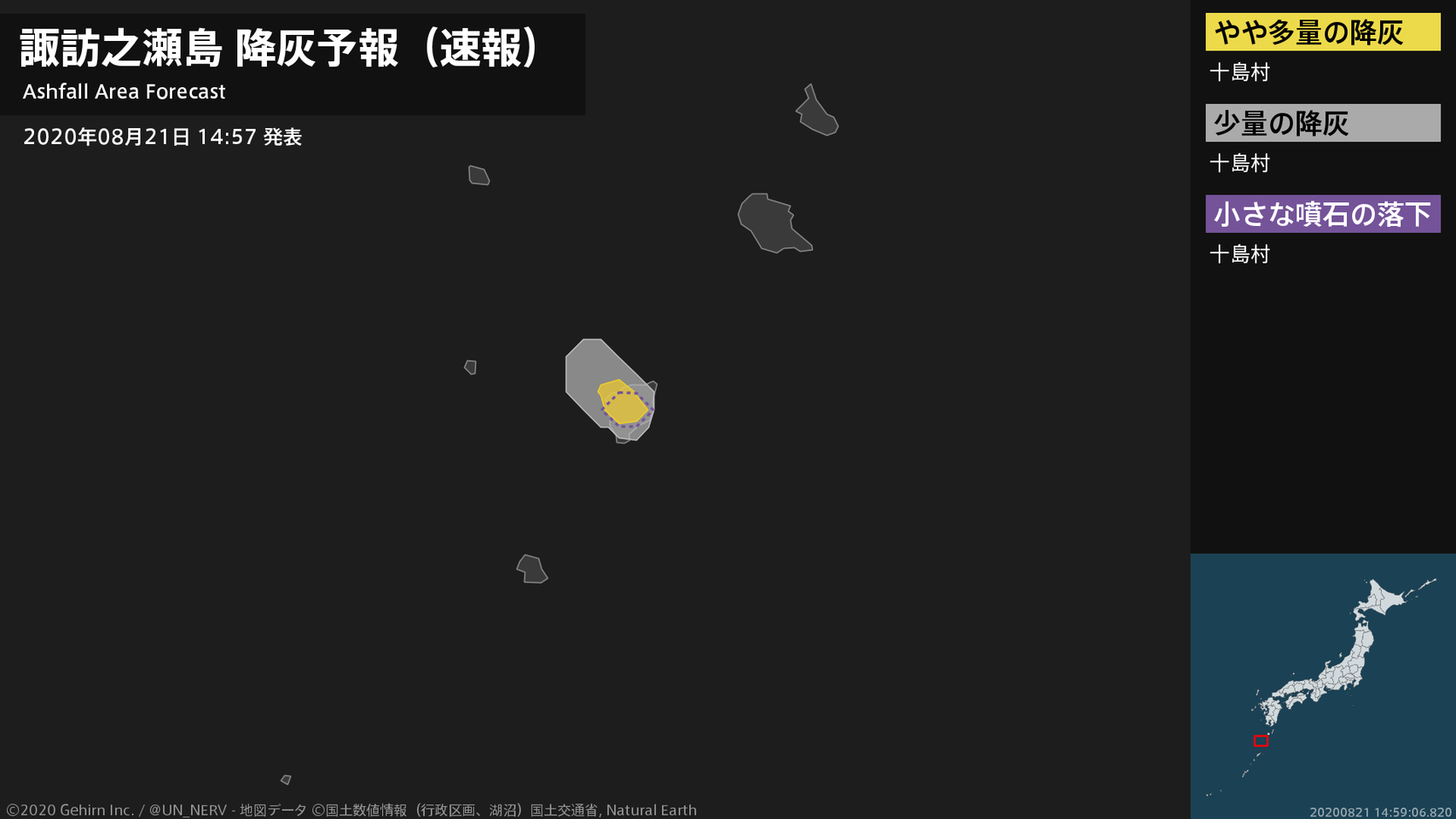 1時間以内に十島村ではやや多量の降灰があり、降灰は鹿児島県十島村まで予想されます。また、火口から南西方向およそ1kmまでの範囲では、小さな噴石が風に流されて降るおそれがあります。