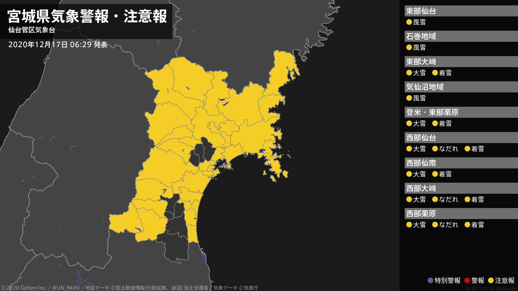 【宮城県 気象警報・注意報 2020年12月17日 06:29】東部では、17日夜遅くまで風雪に注意してください。宮城県では、17日昼前まで大雪や電線等への着雪に注意してください。西部では、17日までなだれに注意してください。#気象警報注意報 #宮城県