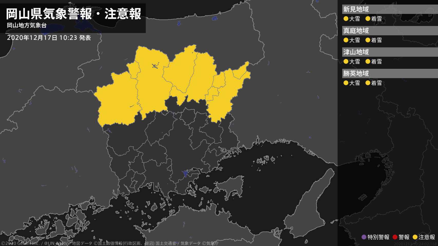 【岡山県 気象警報・注意報 2020年12月17日 10:24】北部では、17日夕方まで大雪や電線等への着雪に注意してください。#気象警報注意報 #岡山県