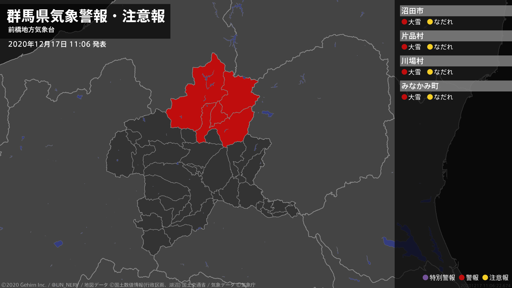 【群馬県 気象警報・注意報 2020年12月17日 11:06】北部では、17日夕方まで大雪に警戒してください。#気象警報注意報 #群馬県
