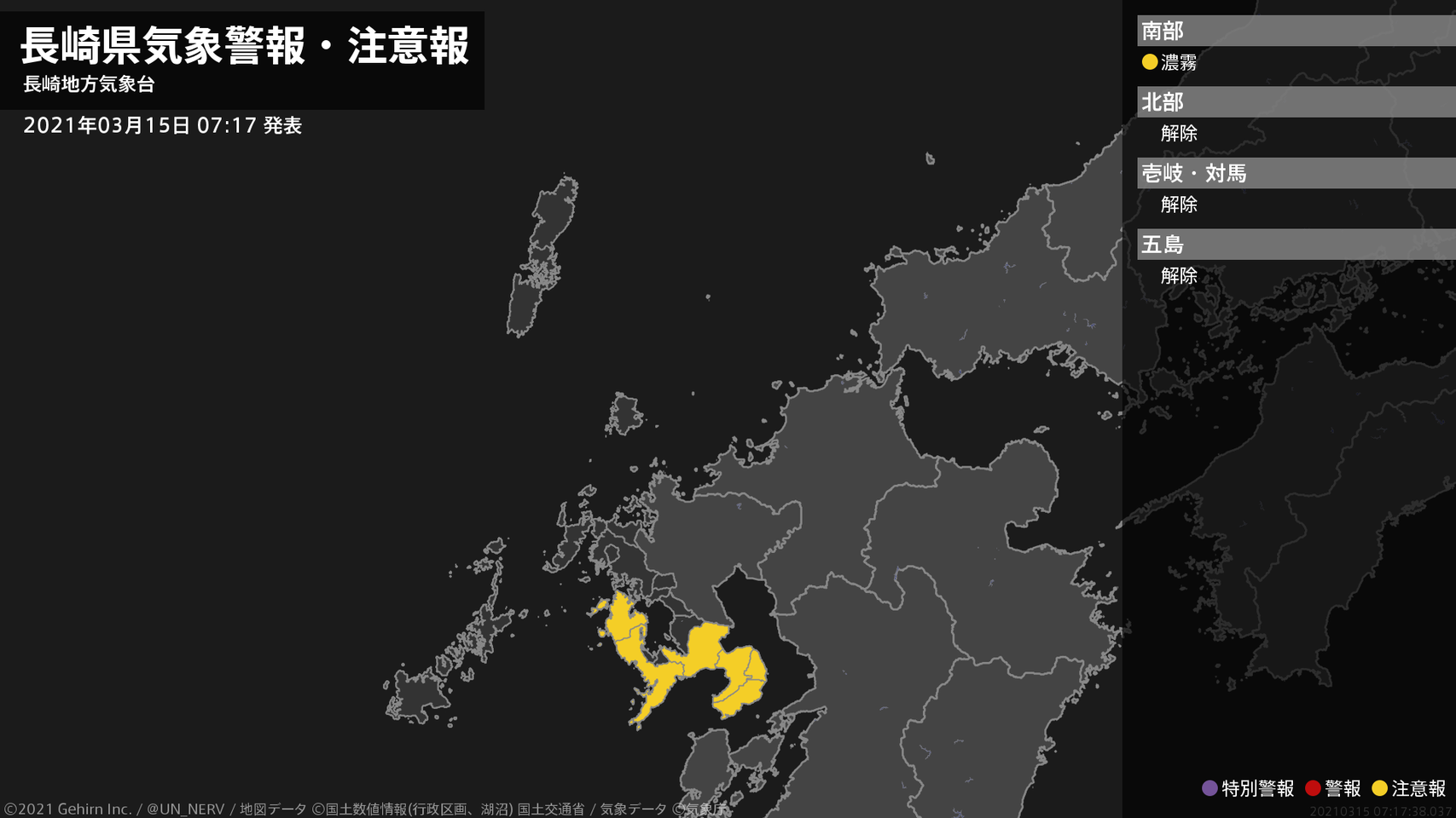 【長崎県 気象警報・注意報 2021年03月15日 07:17】南部では、15日昼前まで濃霧による視程障害に注意してください。#気象警報注意報 #長崎県