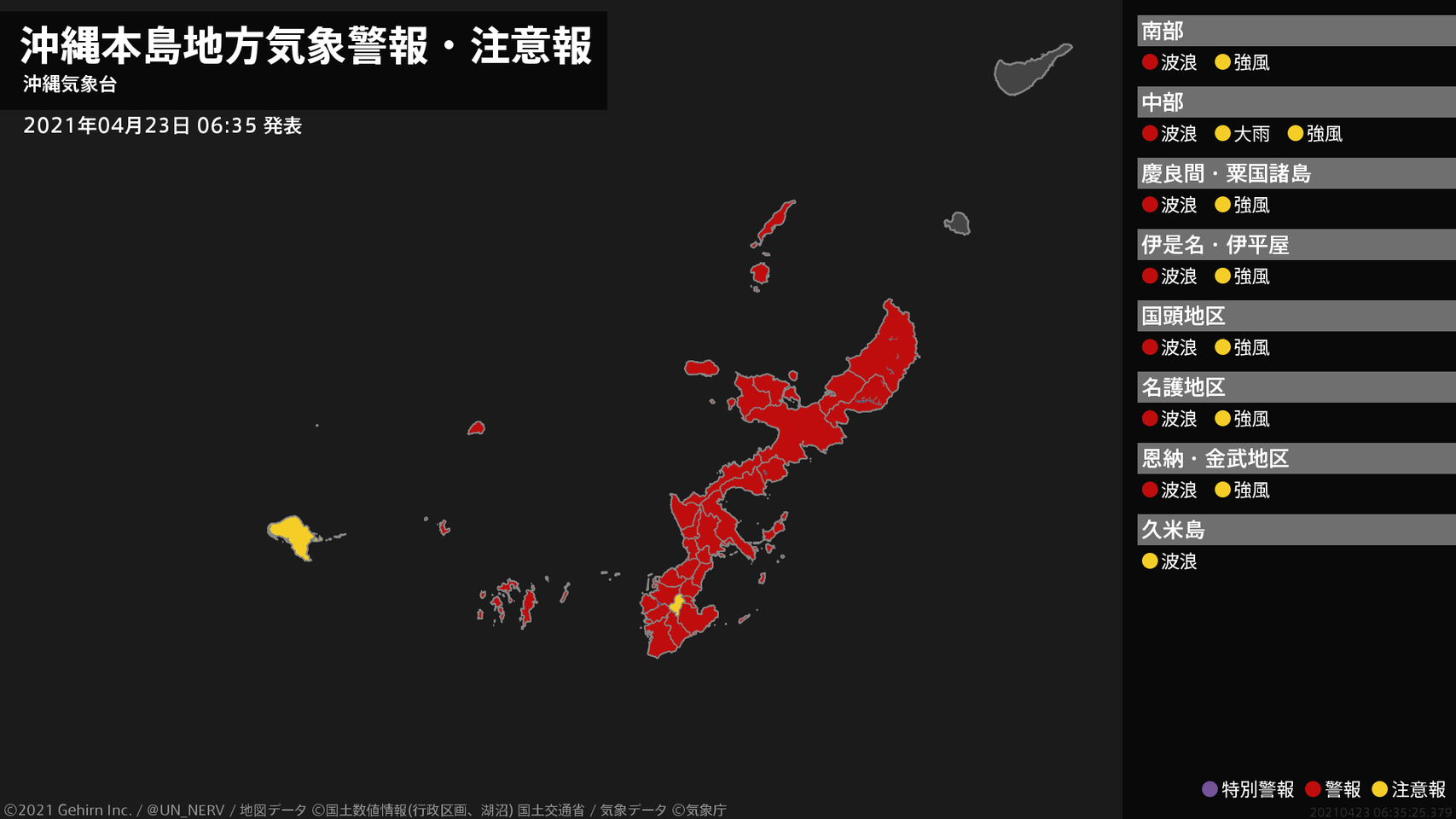 【沖縄本島地方 気象警報 2021年04月23日 06:35】本島中南部、本島北部では、23日昼過ぎから高波に警戒してください。#気象警報 #気象警報注意報 #沖縄本島地方