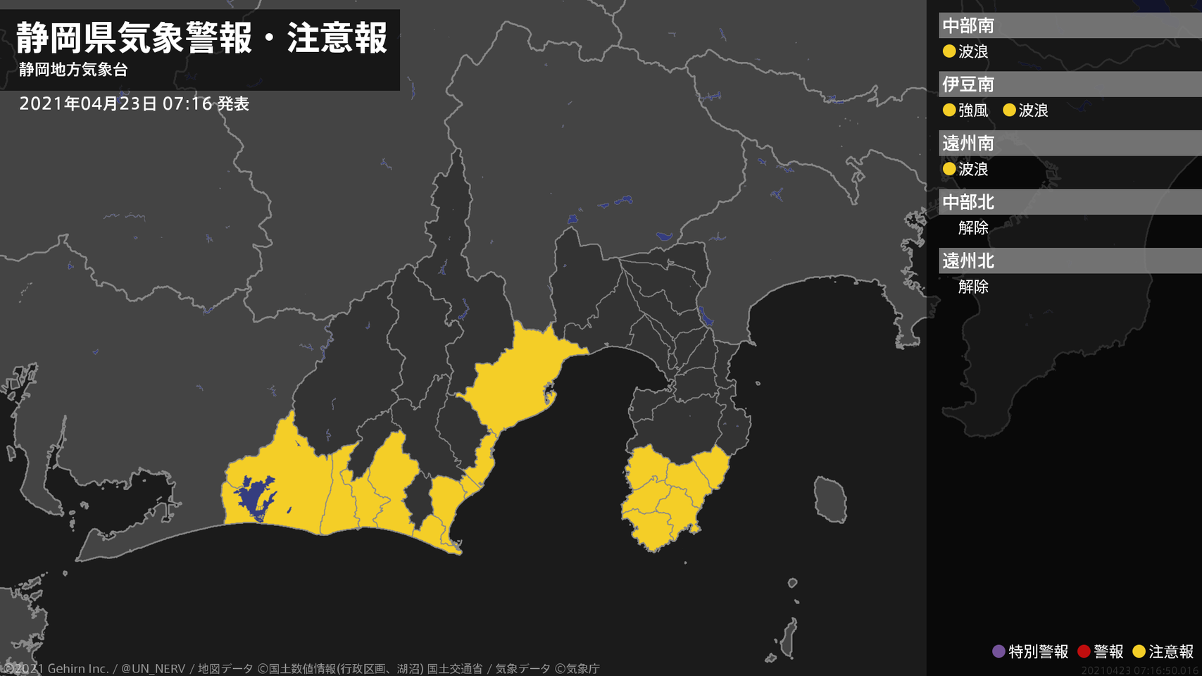 【静岡県 気象警報・注意報 2021年04月23日 07:16】伊豆では、23日昼前まで強風に注意してください。中部、伊豆、西部では、23日昼前まで高波に注意してください。#気象警報注意報 #静岡県