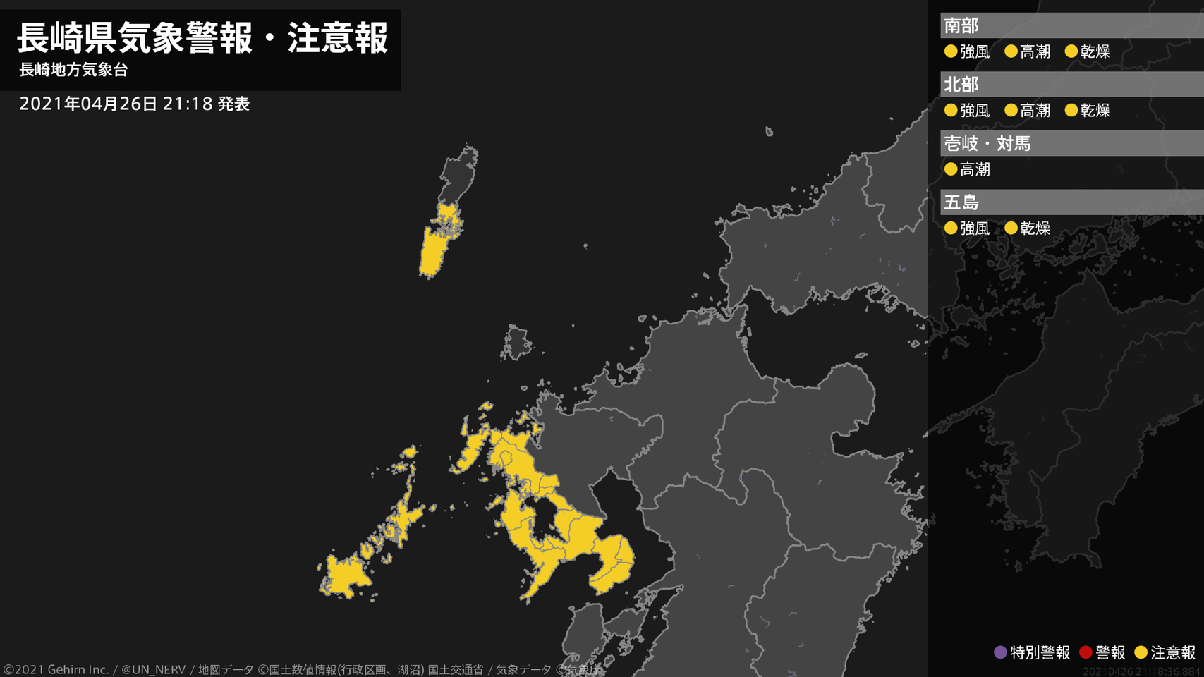 【長崎県 気象警報・注意報 2021年04月26日 21:18】南部、北部、五島では、強風と、空気の乾燥した状態が続くため火の取り扱いに注意してください。南部、北部、壱岐・対馬では、高潮に注意してください。#気象警報注意報 #長崎県
