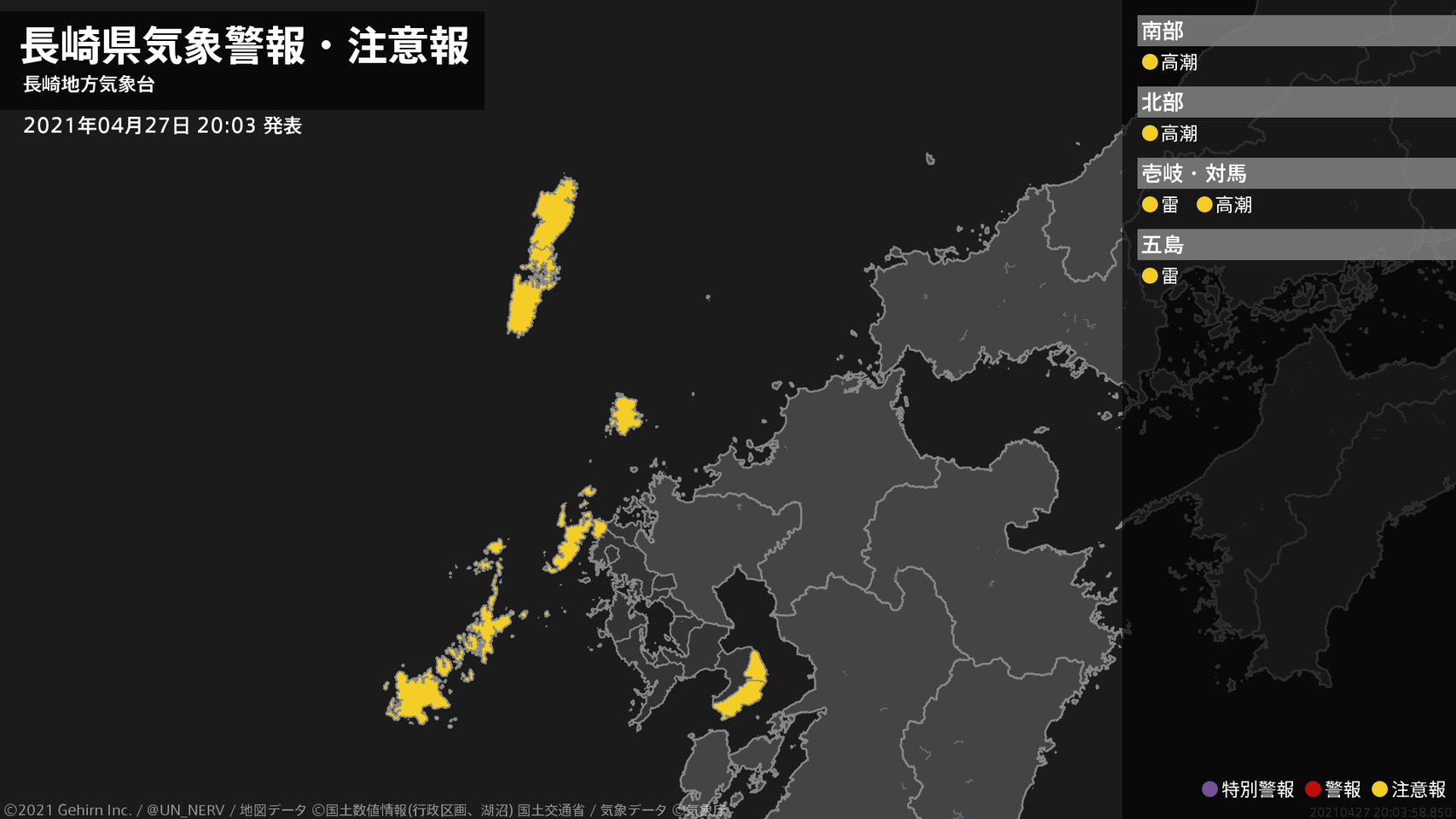 【長崎県 気象警報・注意報 2021年04月27日 20:03】南部、北部、壱岐・対馬では、高潮に注意してください。壱岐・対馬、五島では、急な強い雨や落雷に注意してください。#気象警報注意報 #長崎県