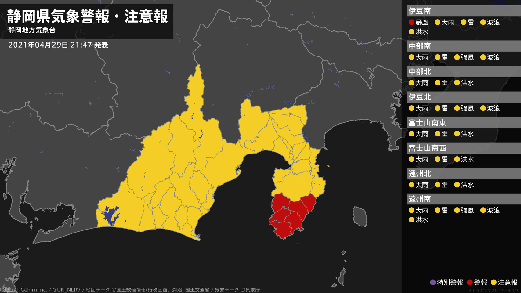 【静岡県 気象警報 2021年04月29日 21:47】伊豆では、30日未明まで暴風に警戒してください。#気象警報 #気象警報注意報 #静岡県