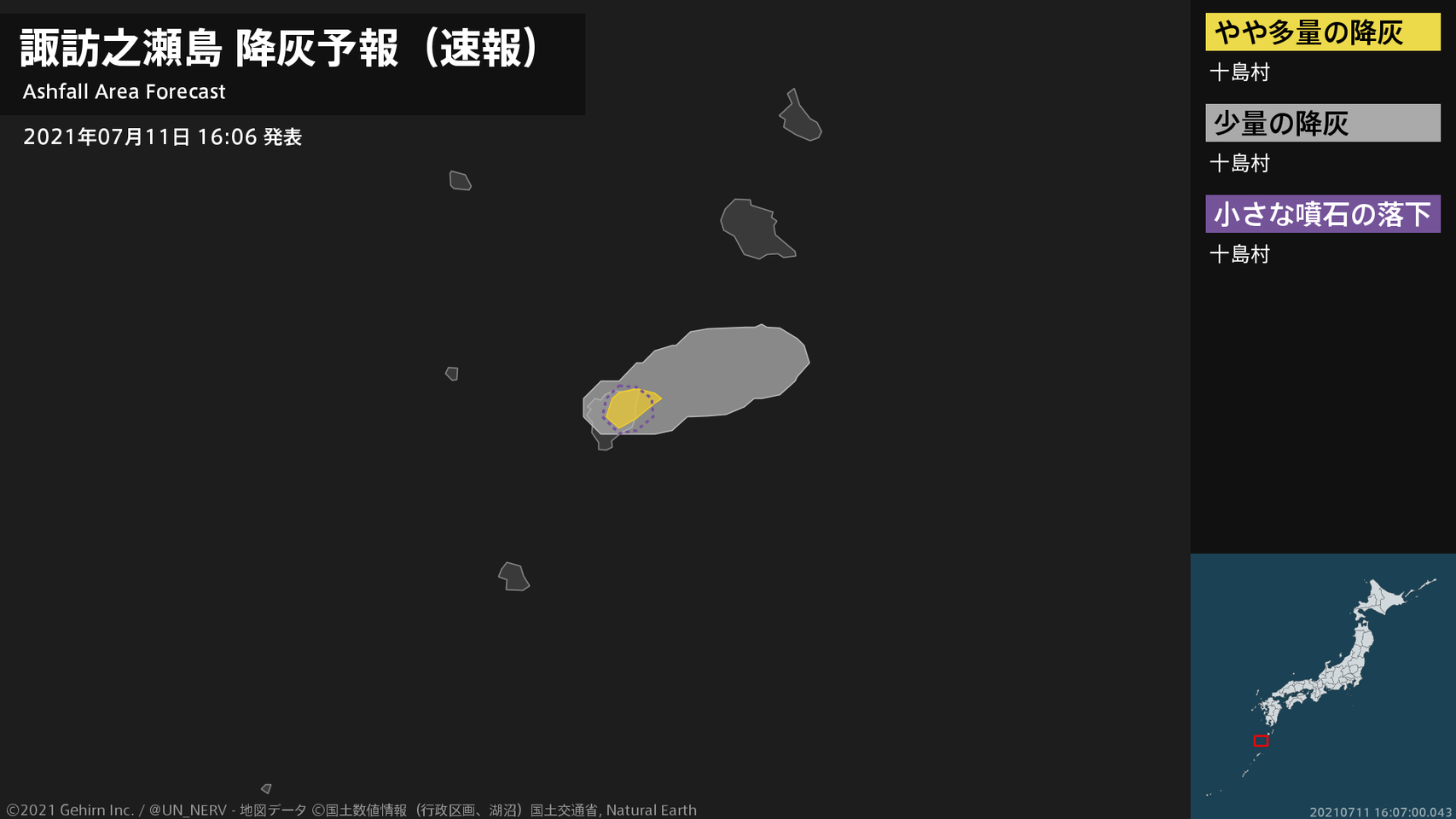 1時間以内に十島村ではやや多量の降灰があり、降灰は鹿児島県十島村まで予想されます。また、火口から北東方向およそ3kmまでの範囲では、小さな噴石が風に流されて降るおそれがあります。