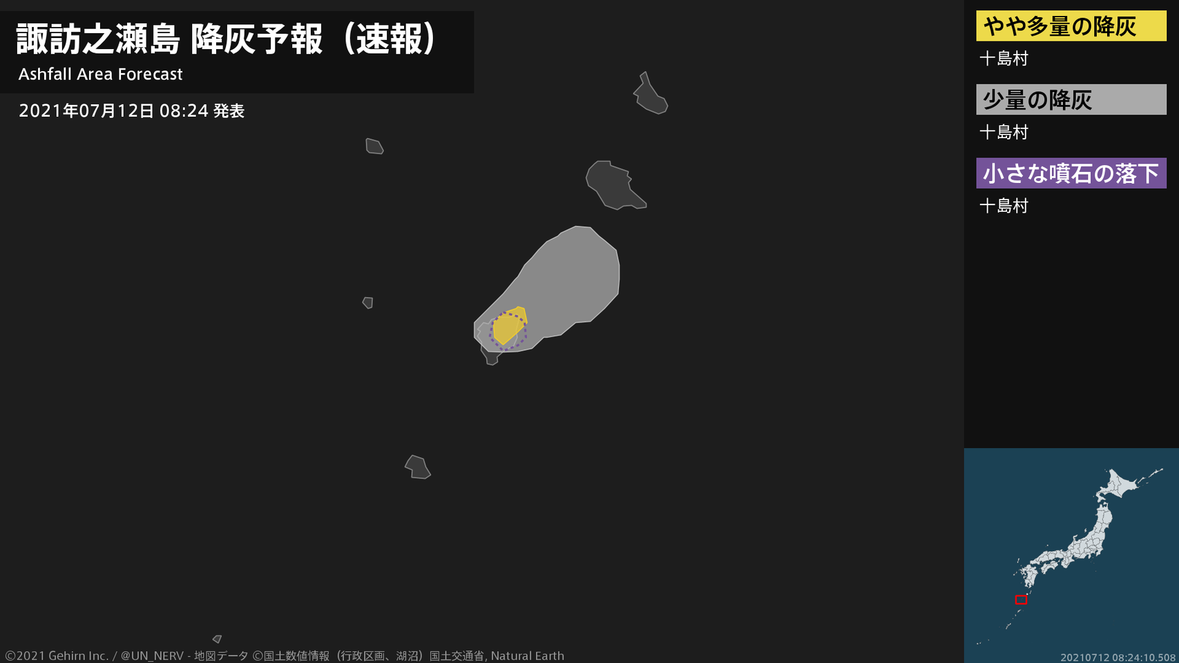 【諏訪之瀬島 降灰予報(速報)】1時間以内に十島村ではやや多量の降灰があり、降灰は鹿児島県十島村まで予想されます。また、火口から北東方向およそ3kmまでの範囲では、小さな噴石が風に流されて降るおそれがあります。#降灰予報(速報)