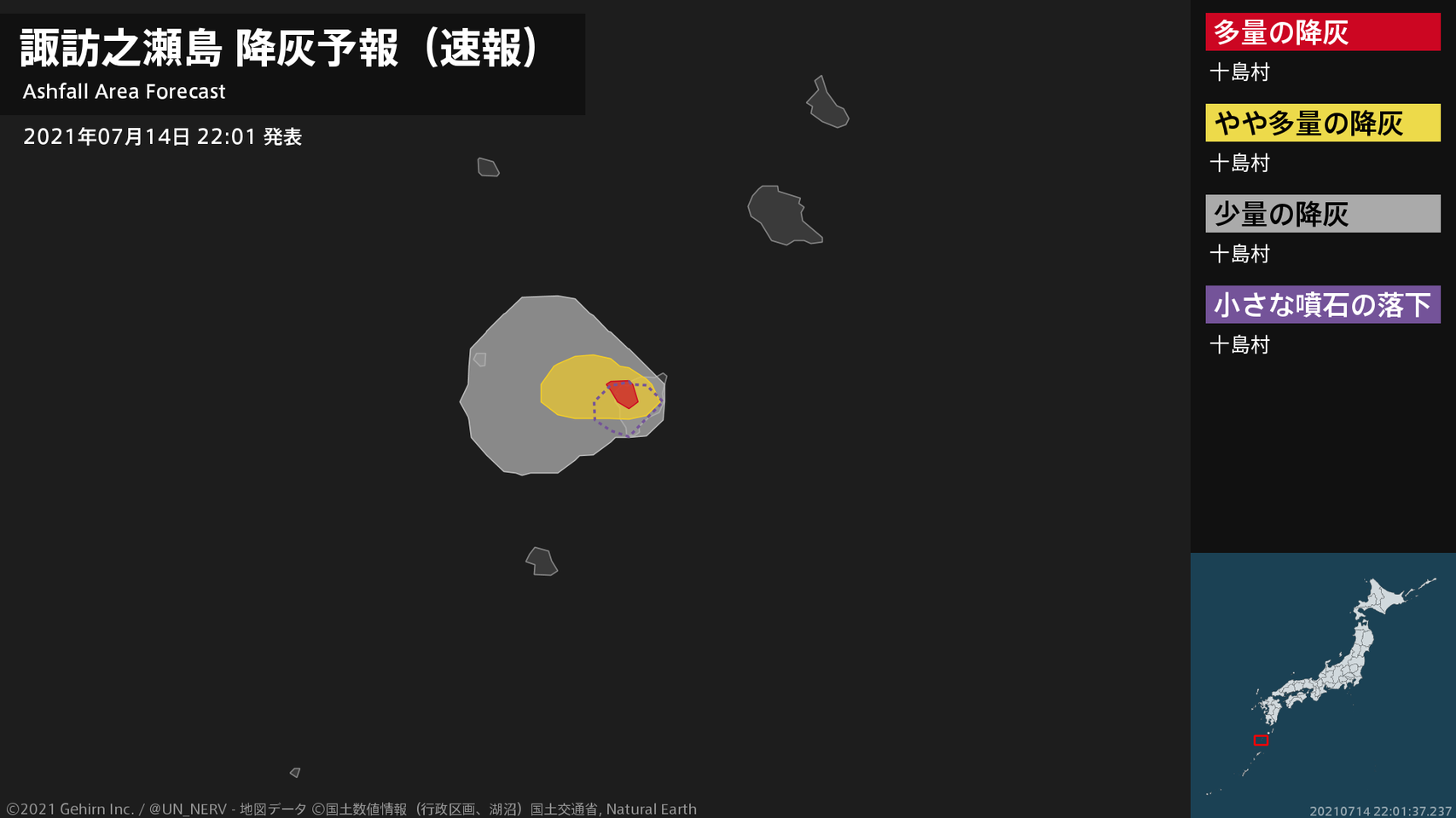 【諏訪之瀬島 噴火に関する火山観測報 2021年07月14日 22:00】14日 21時52分頃、諏訪之瀬島(御岳火口)で噴火がありました。噴煙高度は火口上3100m、噴煙の流向は北西です。#火山 #奄美地方