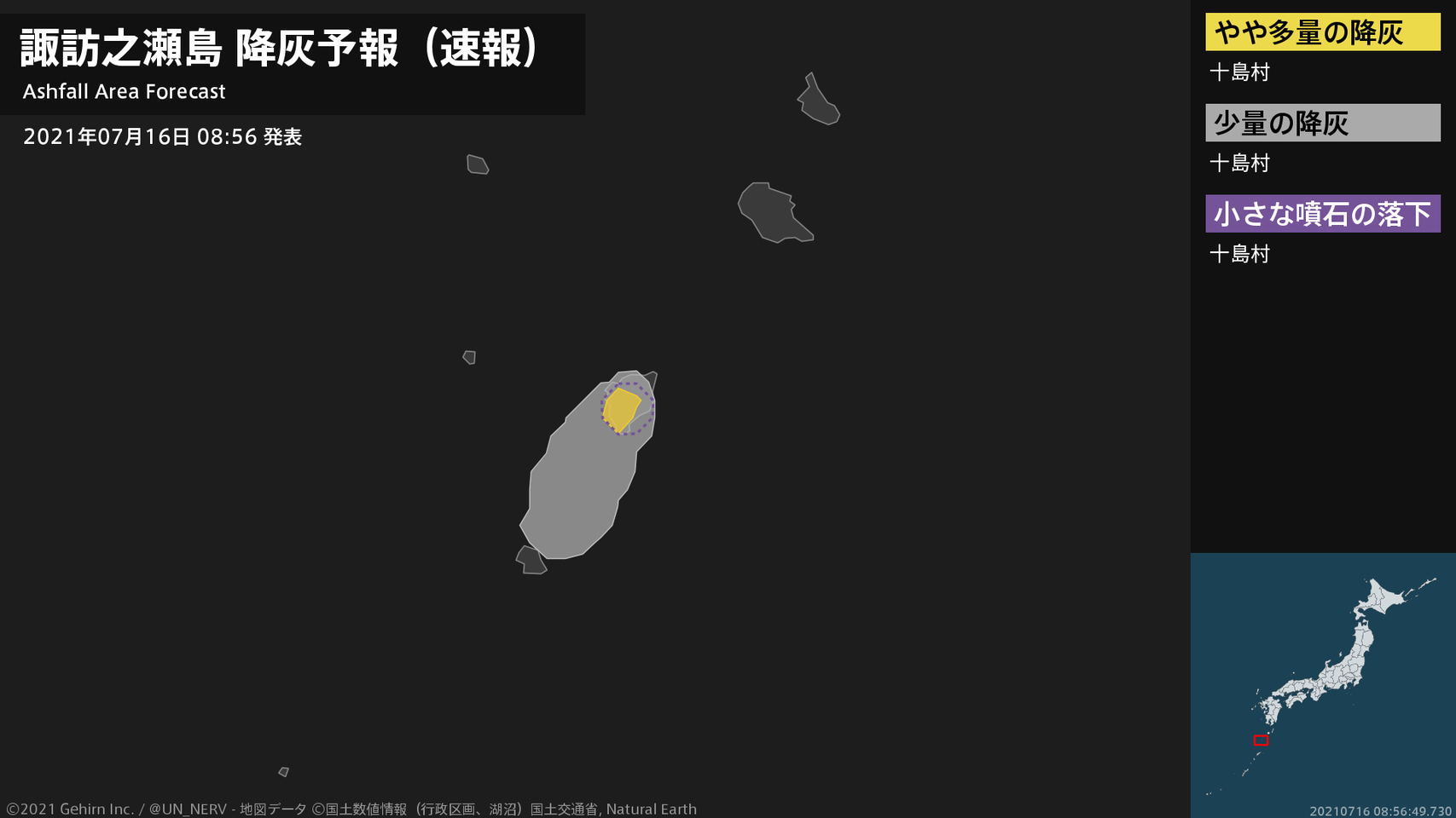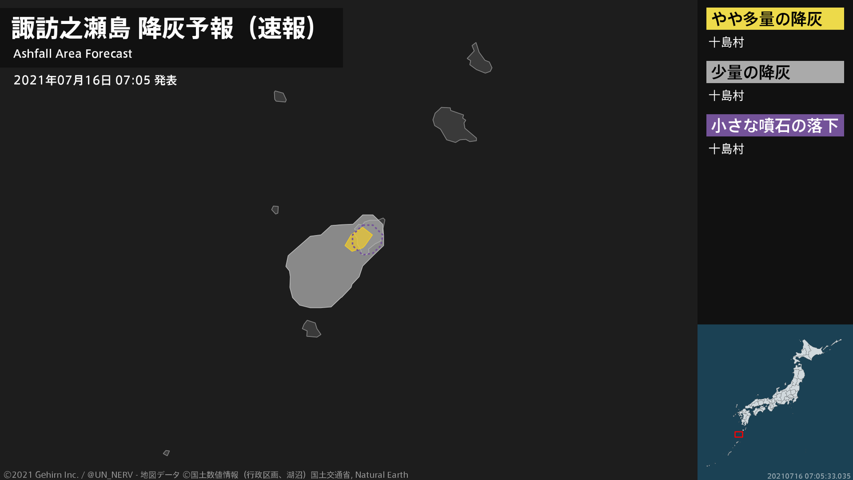 【諏訪之瀬島 降灰予報(速報)】1時間以内に十島村ではやや多量の降灰があり、降灰は鹿児島県十島村まで予想されます。また、火口から南方向およそ3kmまでの範囲では、小さな噴石が風に流されて降るおそれがあります。#降灰予報(速報)