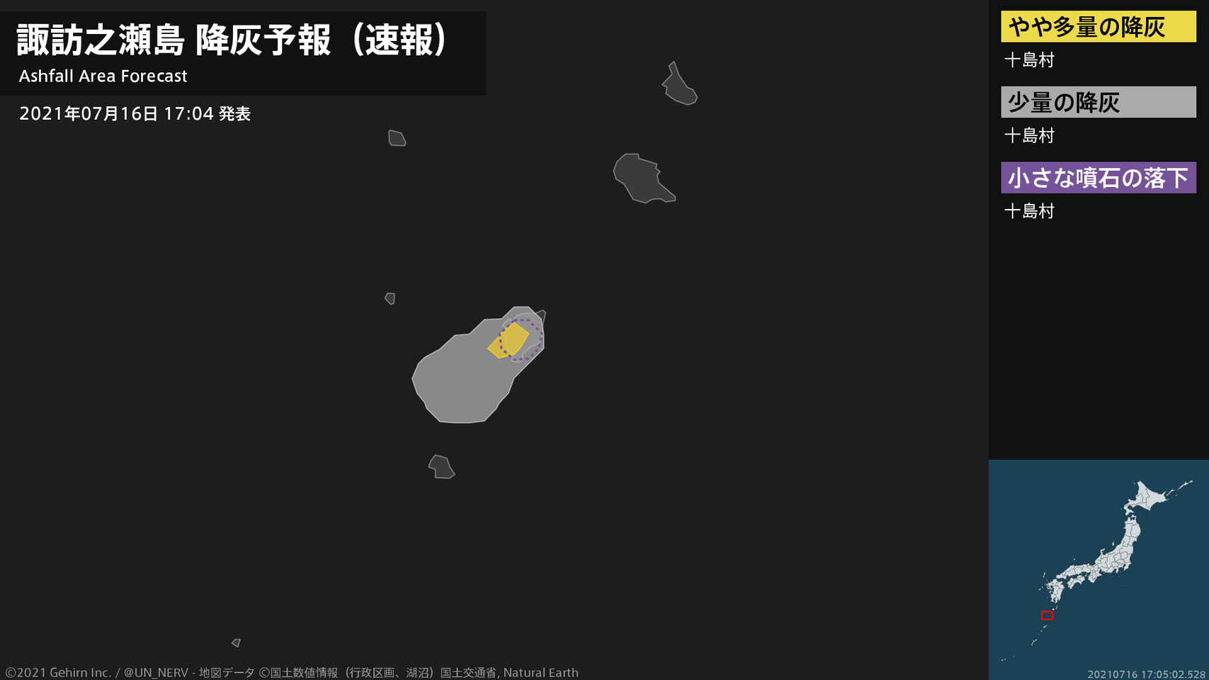 1時間以内に十島村ではやや多量の降灰があり、降灰は鹿児島県十島村まで予想されます。また、火口から南方向およそ3kmまでの範囲では、小さな噴石が風に流されて降るおそれがあります。