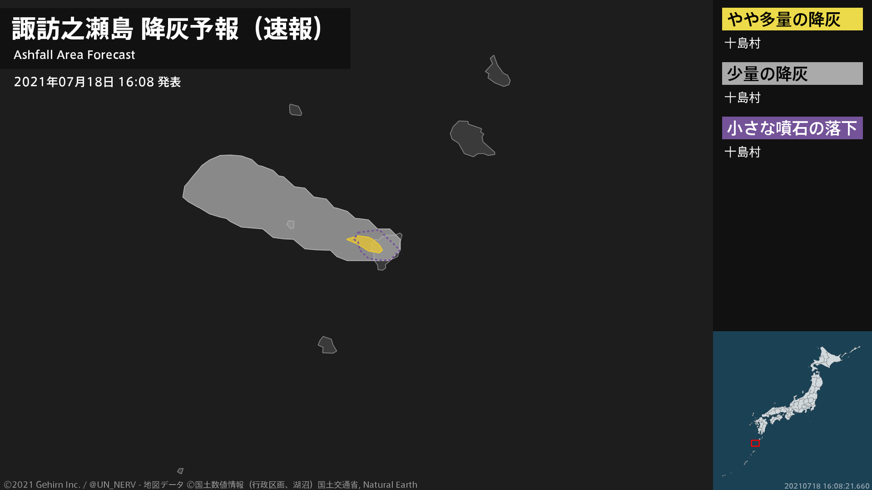 【諏訪之瀬島 降灰予報(速報)】1時間以内に十島村ではやや多量の降灰があり、降灰は鹿児島県十島村まで予想されます。また、火口から北西方向およそ6kmまでの範囲では、小さな噴石が風に流されて降るおそれがあります。#降灰予報(速報)