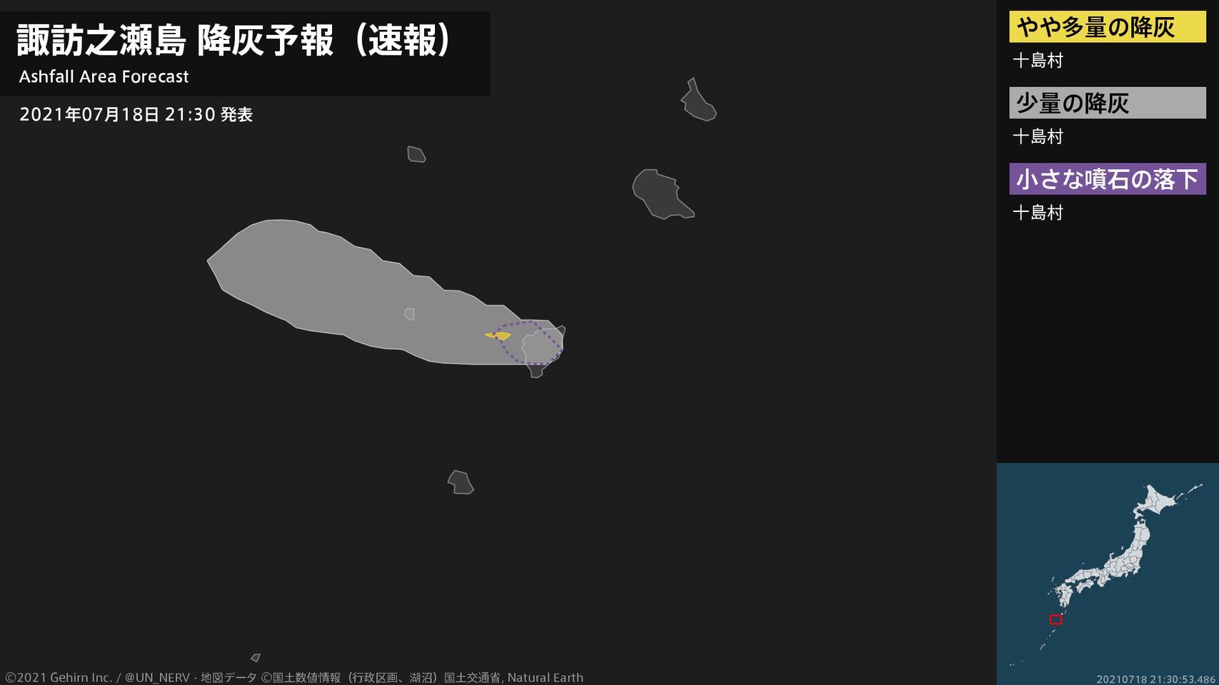 【諏訪之瀬島 噴火に関する火山観測報 2021年07月18日 21:30】18日 21時20分頃、諏訪之瀬島(御岳火口)で噴火がありました。噴煙高度は火口上2100m、噴煙の流向は北西です。#火山 #奄美地方