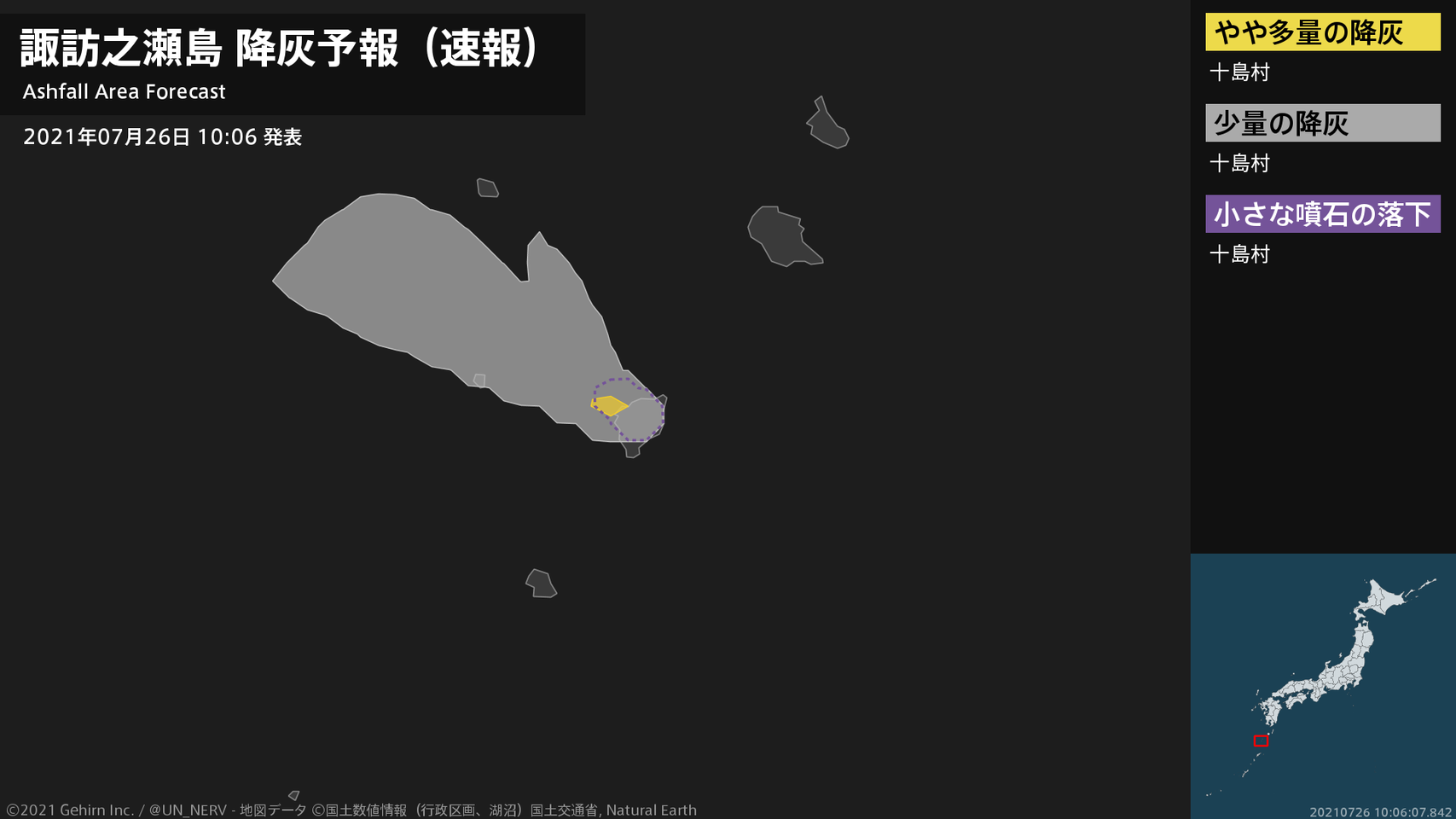 【諏訪之瀬島 噴火に関する火山観測報 2021年07月26日 10:05】26日 09時55分頃、諏訪之瀬島(御岳火口)で噴火がありました。噴煙高度は火口上2300m、噴煙の流向は西です。#火山 #奄美地方