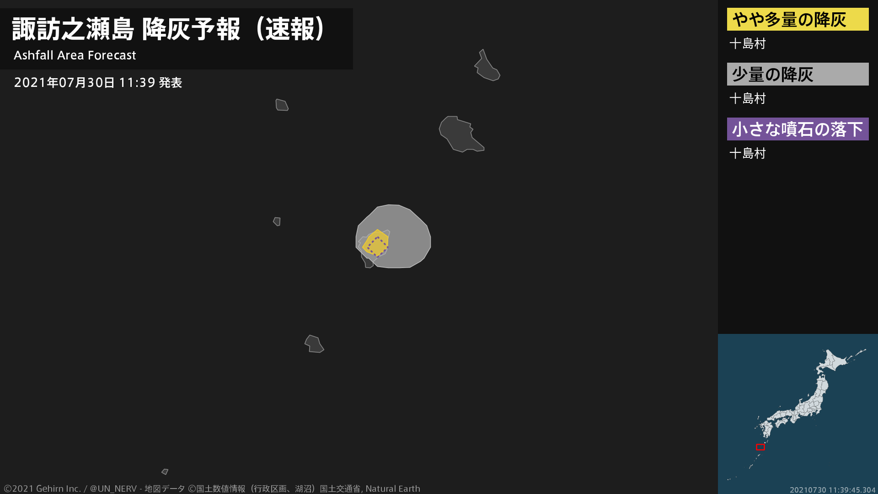 【諏訪之瀬島 噴火に関する火山観測報 2021年07月30日 11:38】30日 11時33分頃、諏訪之瀬島(御岳火口)で噴火がありました。噴煙高度は火口上2600m、噴煙の流向は東です。#火山 #奄美地方
