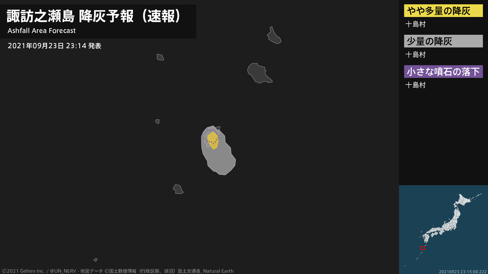 【諏訪之瀬島 噴火に関する火山観測報 2021年09月23日 22:08】23日 22時03分頃、諏訪之瀬島(御岳火口)で噴火がありました。噴煙高度は火口上1000m、噴煙の流向は南です。#火山 #奄美地方