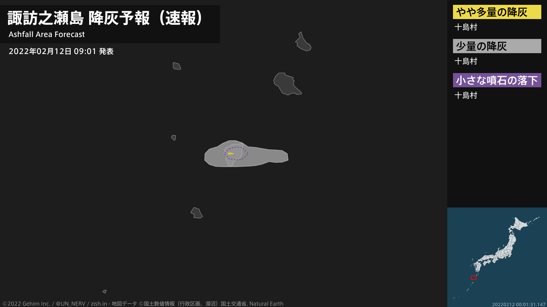 【諏訪之瀬島 噴火に関する火山観測報 2022年02月12日 08:59】12日 08時50分頃、諏訪之瀬島(御岳火口)で噴火がありました。噴煙高度は火口上1300m、噴煙の流向は西です。#火山 #奄美地方