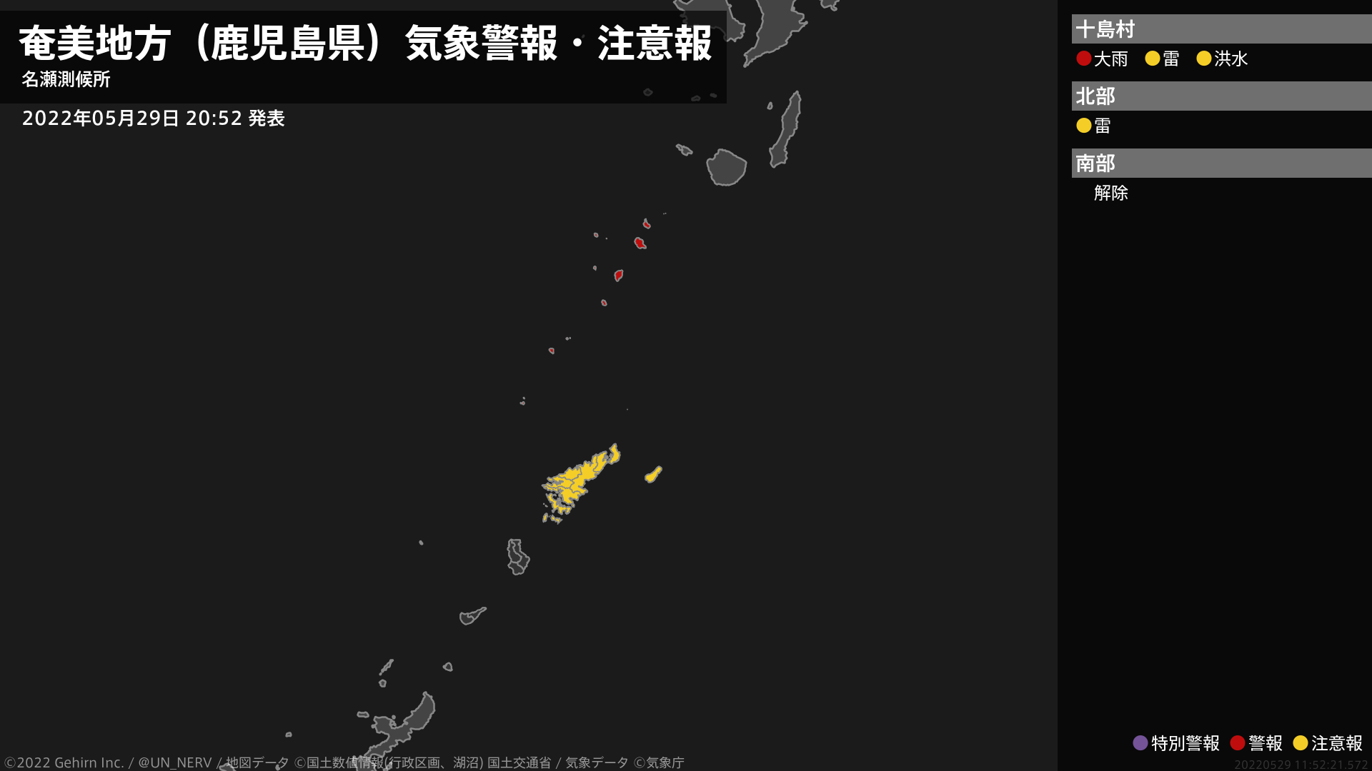 【奄美地方(鹿児島県) 気象警報・注意報 2022年05月29日 20:52】奄美地方では、30日昼前まで土砂災害に警戒してください。#気象警報注意報 #奄美地方