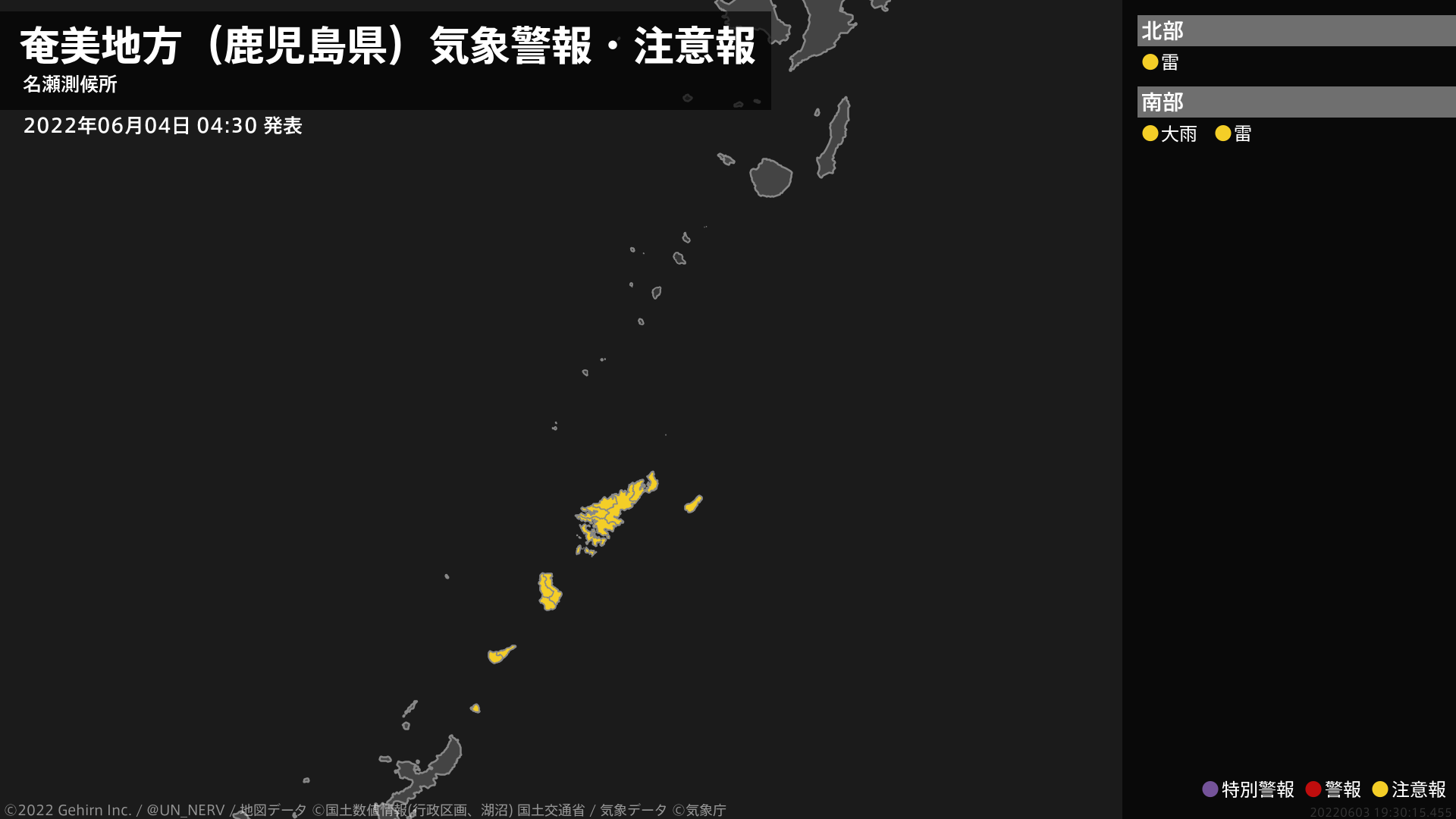 【奄美地方(鹿児島県) 気象警報・注意報 2022年06月04日 04:30】奄美地方では、土砂災害や落雷に注意してください。#気象警報注意報 #奄美地方