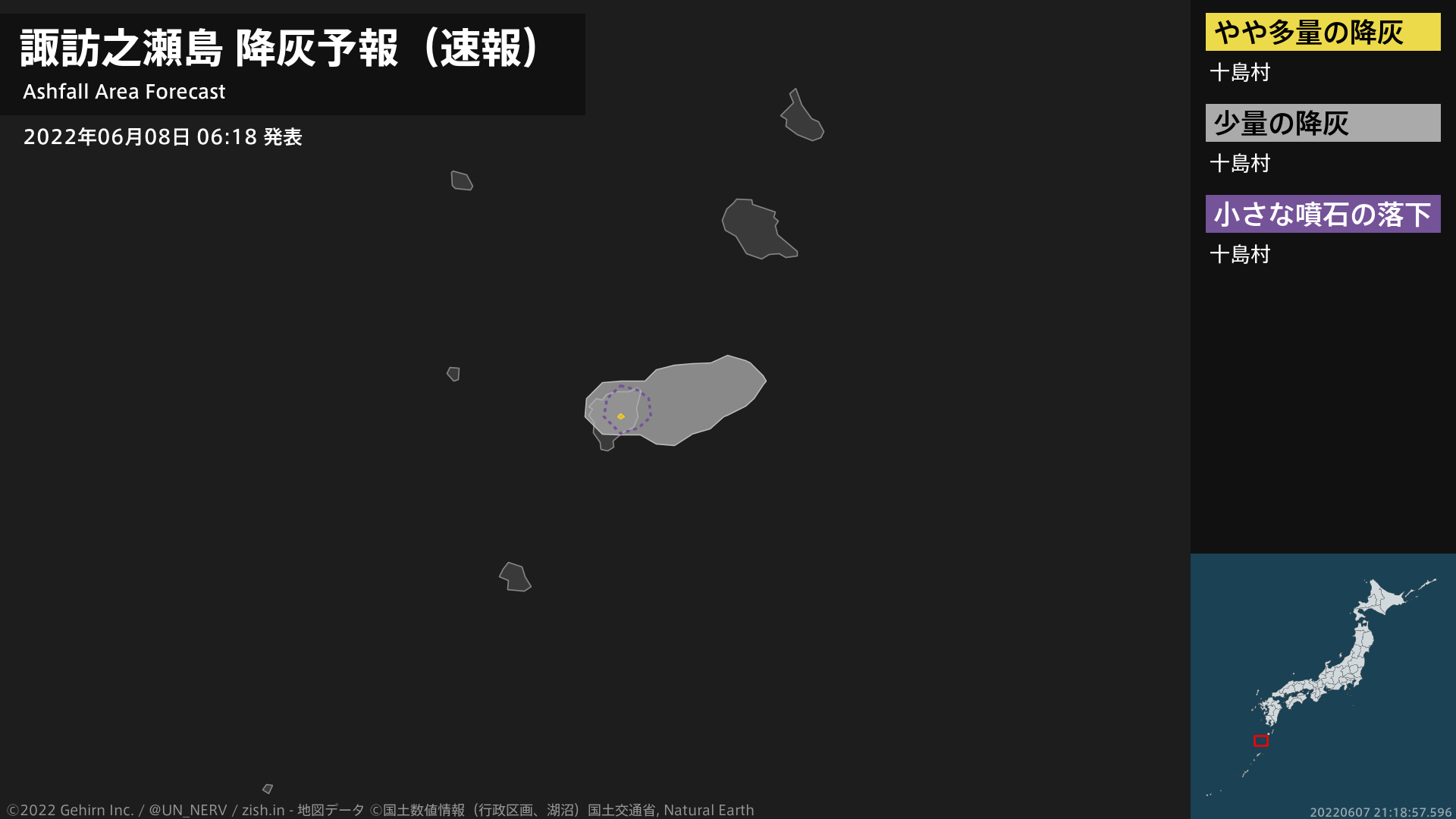 【諏訪之瀬島 降灰予報(速報)】1時間以内に十島村ではやや多量の降灰があり、降灰は鹿児島県十島村まで予想されます。また、火口から北東方向およそ3kmまでの範囲では、小さな噴石が風に流されて降るおそれがあります。#降灰予報(速報)